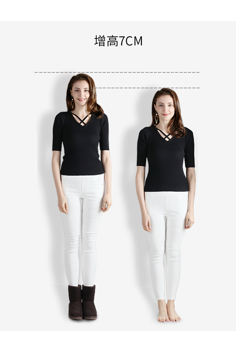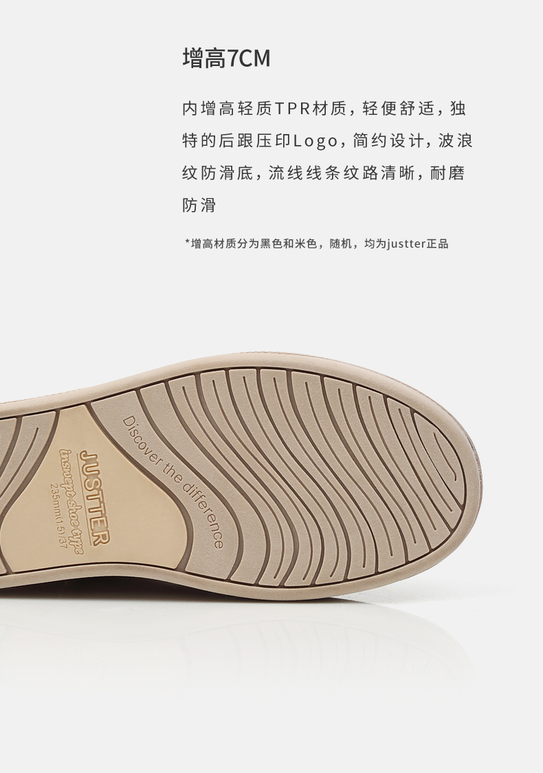 增高垫轻质TPR材质,能内增高7cm。采用独特的压印工艺的新版后跟Logo,全新双色TPR橡胶鞋底,搭配鞋底的波浪防滑纹,耐磨防滑。