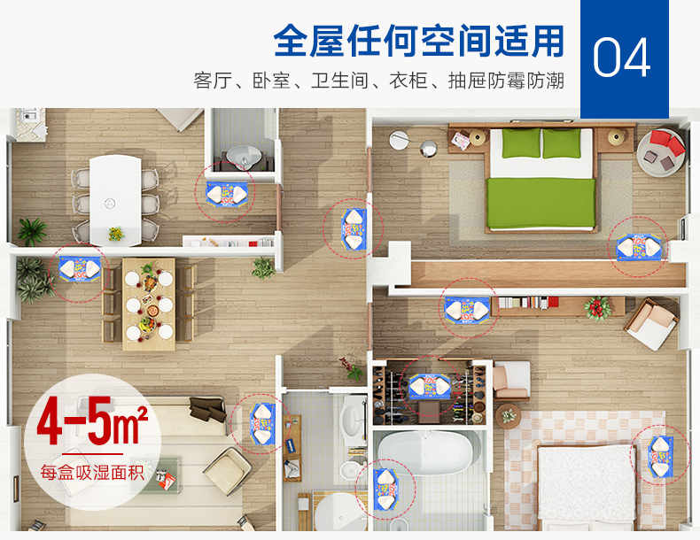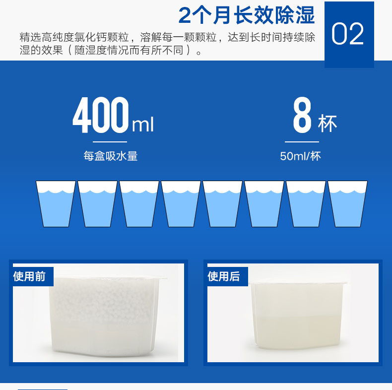 选用高纯度的氯化钙颗粒,当需要溶解每一颗颗粒时,都要有大量的水汽,这样就能达到长时间持续除湿的效果。盒子表层有高品质的防漏透气膜,密度细腻,锁住水汽,即使不小心反转倒置,盒内的液体也不会渗透出来。可用于客厅、卧室、衣柜、抽屉,尤其是南方雨水较多的城市或靠海的城市都可准备一些。