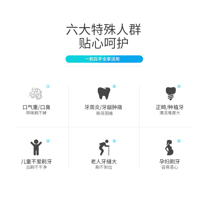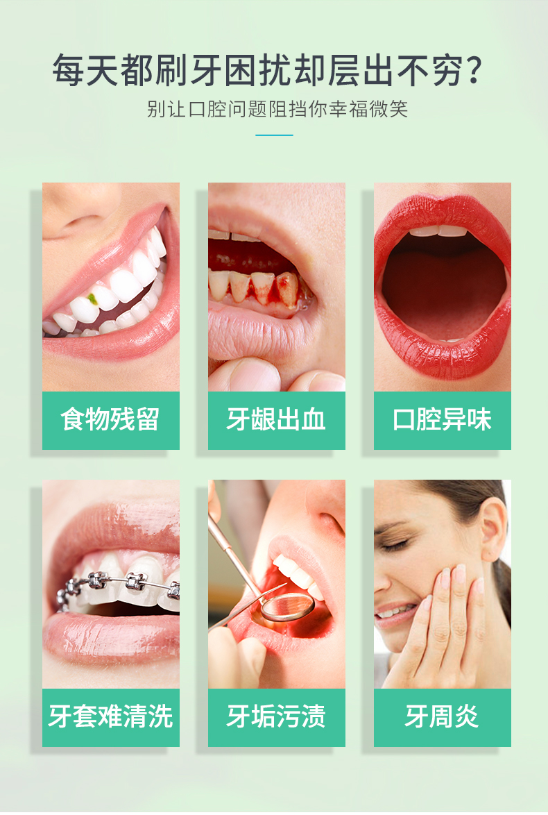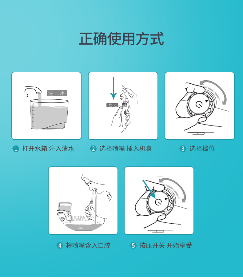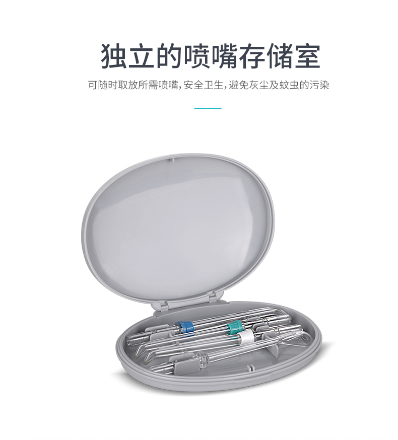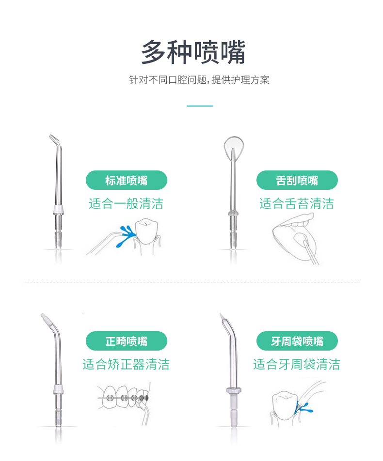 标准喷嘴、正畸喷嘴、牙周袋喷嘴、舌刮喷嘴,共四种不同喷嘴,满足不同使用所需。