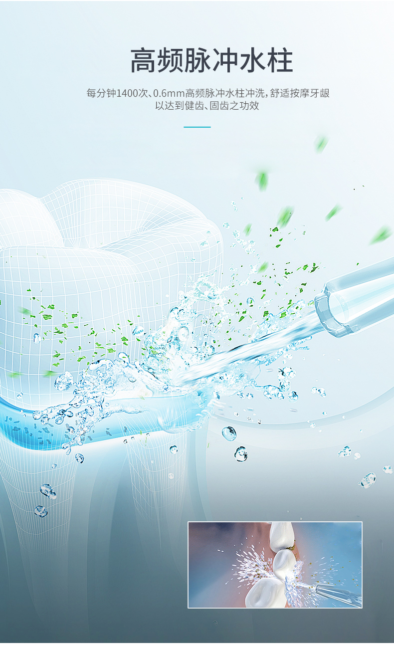 每分钟1400次、0.6mm高频脉冲水柱冲洗,舒适按摩牙龈以达到健齿、固齿之功效。30~110PSl水压任意调节,无档位限制,给您合适的水压。2分钟智能定时30秒间隔提醒,600ml大容量水箱,无需二次加水,使用更方便。