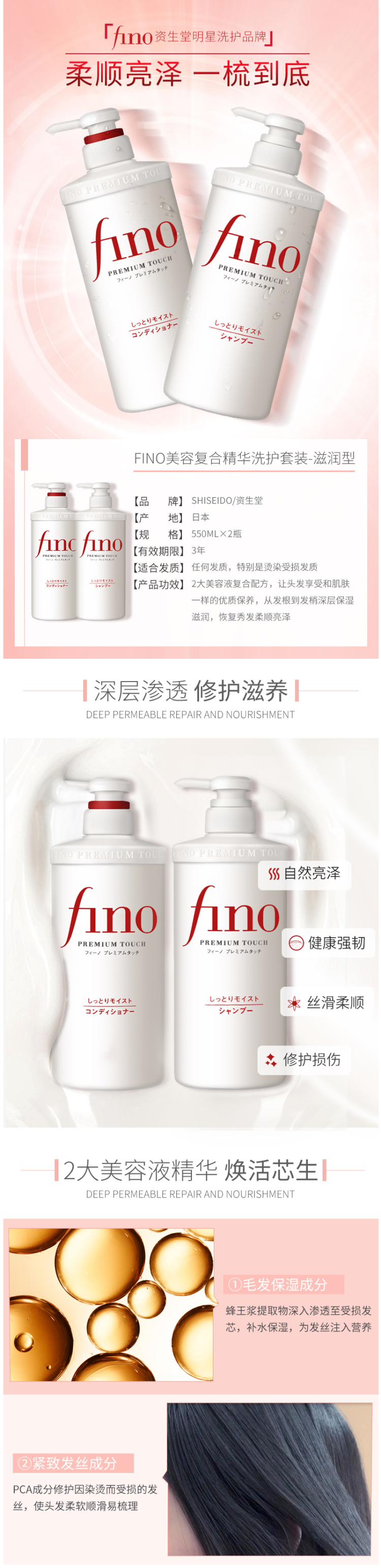 这款资生堂Fino 美容复合精华洗护套装,日本原装进口,包含美容精华复合精华洗发水(滋润型)+美容复合精华护发素(滋润型),适合任何发质,特别是烫染受损发质。