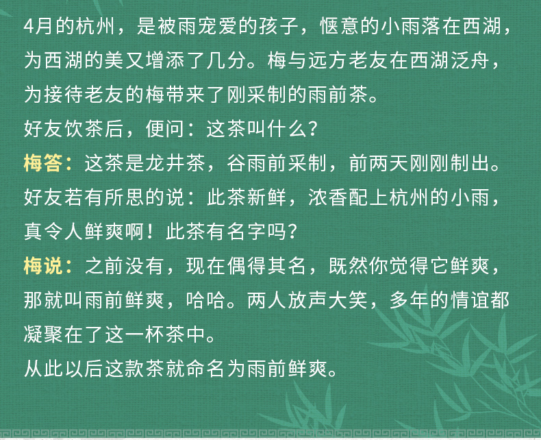 这款梅府茗家 2020老树龙井绿茶雨前鲜爽罐装春茶 ,规格:250g,坚持梅府传承百年的古法制茶工艺,采用传统的摊青、青锅、辉锅等工艺,精准把控每一片叶子的品质得以炒制,具有“色绿、香郁、味甘、形美”品质特征的扁形龙井。