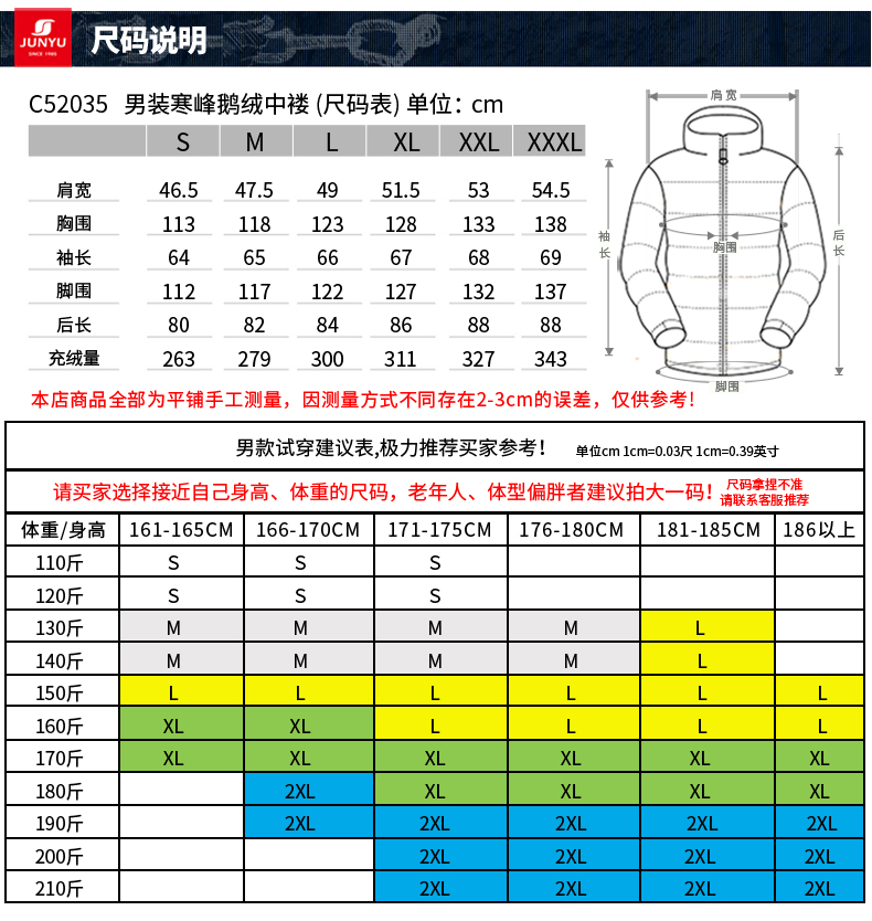 充绒量为:S码263克、M码279克、L码300克、XL码311克、XXL码327克、XXXL码343克