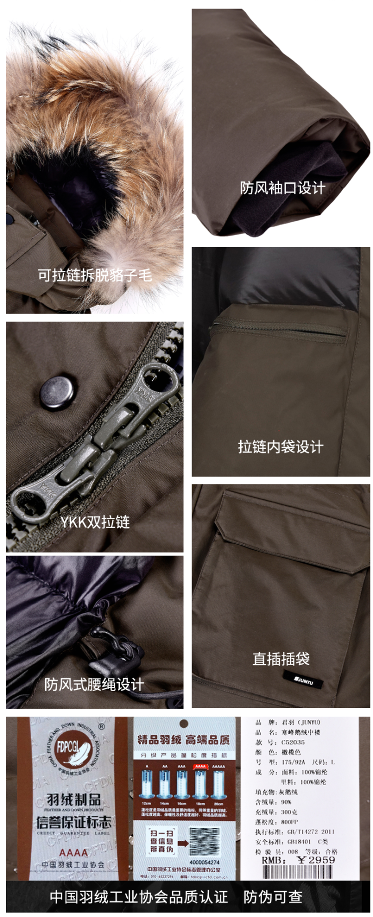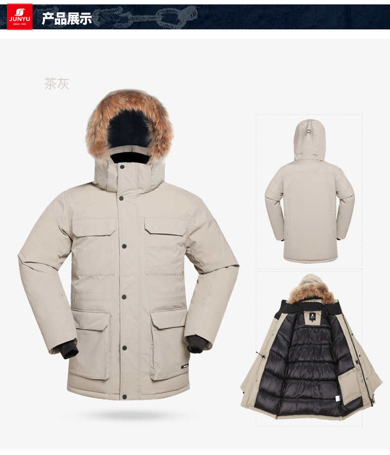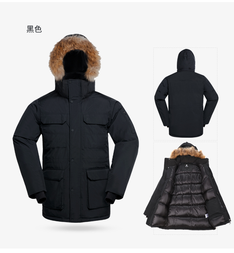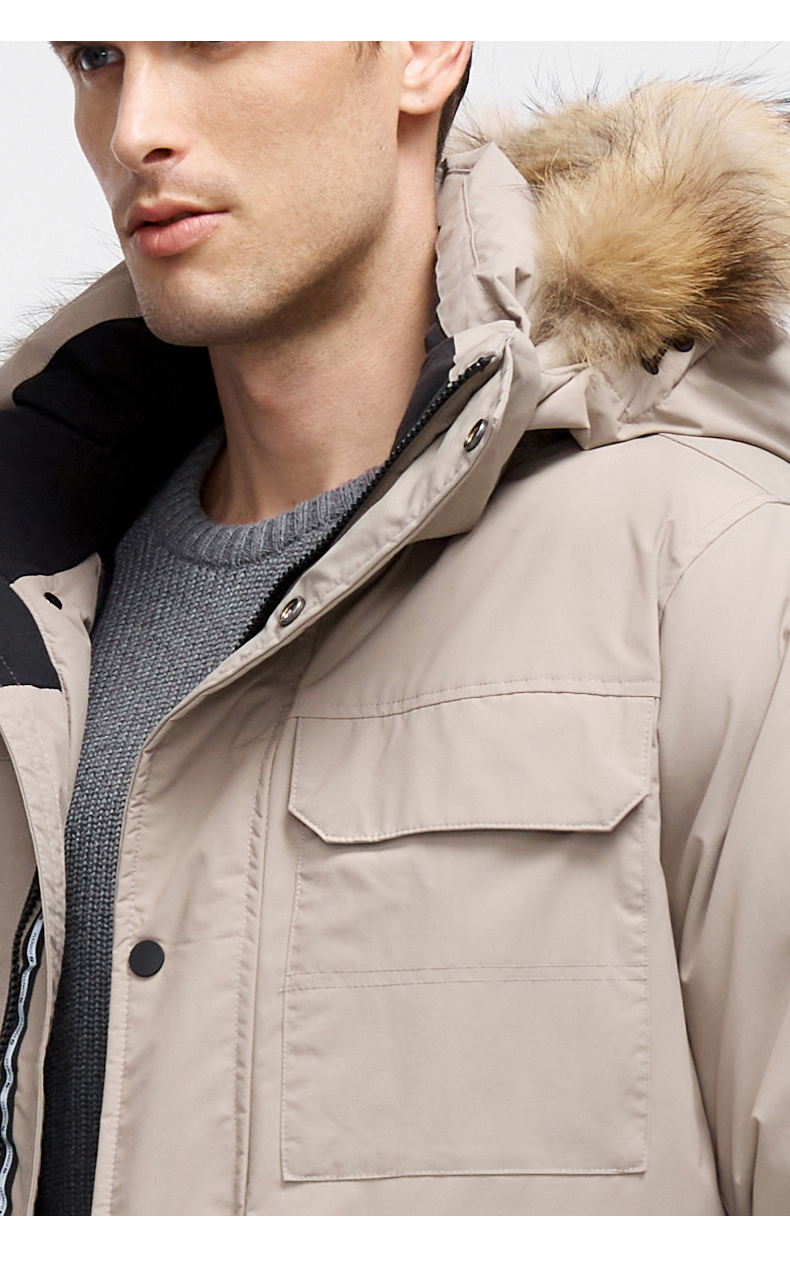这款君羽寒峰男中长款羽绒服,属于极寒系列,可抗-30℃~-40℃,是2018年的冬季款,内里填充了800蓬90%鹅绒,L码充绒300克,属于超重装羽绒服。外层是高密度耐磨锦纶布,伴有压胶加持,可防风防雨雪。工装风款式,长度过臀及大腿。