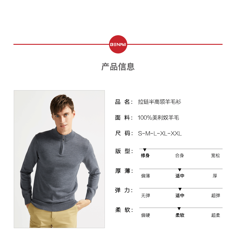 本米这款羊毛衫,采用100%澳大利亚美利奴羊毛(世界上顶级的羊毛),区别于普通的羊毛制品,面料顺滑不扎,贴身穿也没有毛刺感。