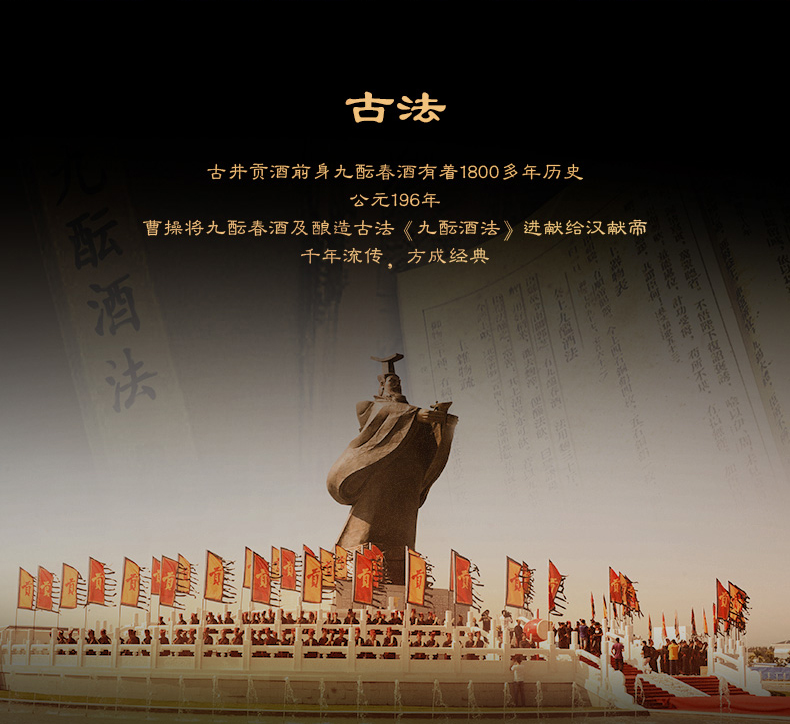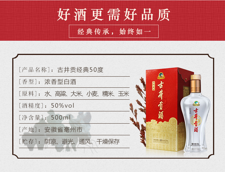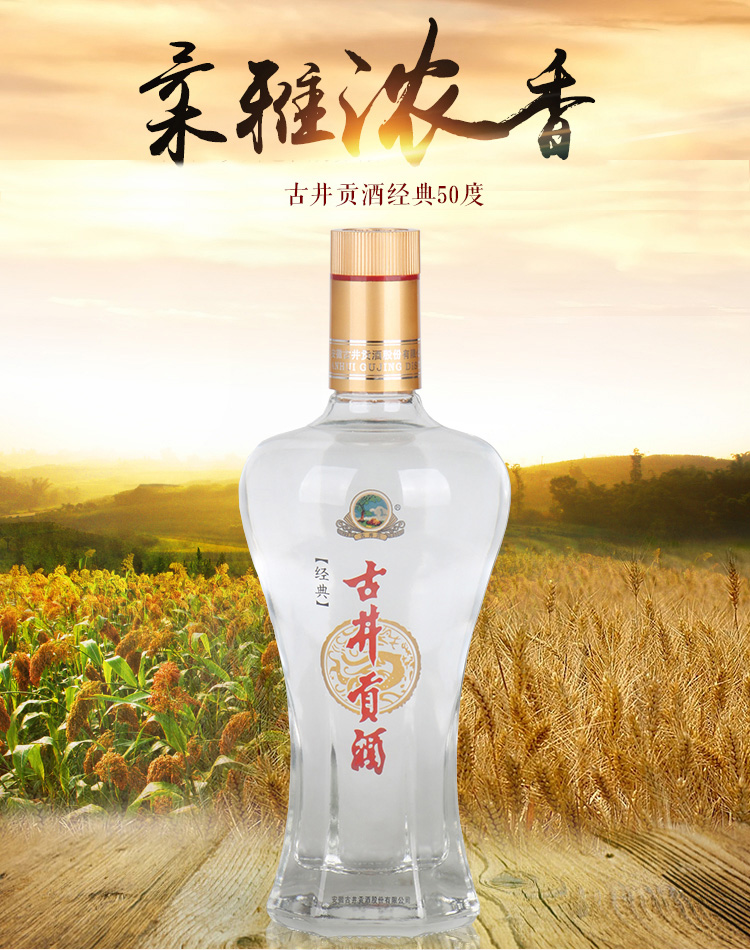 古井贡酒,属于浓香型白酒,具有“色清如水晶,香醇如幽兰,入口甘美醇和,回昧经久不息”的特点。以安徽淮北平原优质小麦、古井镇优质地下水以及颗粒饱满、糯性强的优质高梁为原料,并在亳州市古井镇特定区域范围内,利用其自然微生物环境,按古井贡酒传统工艺生产而成。