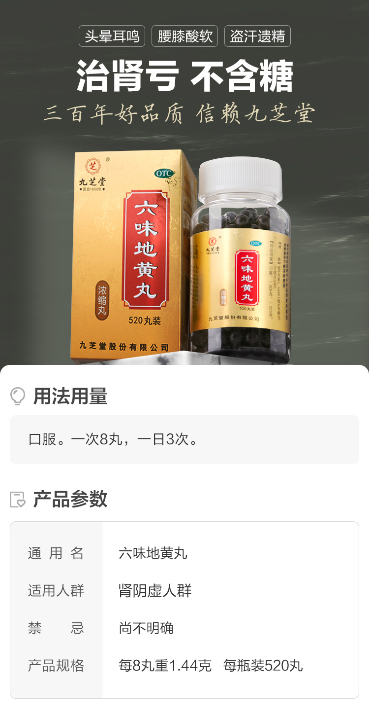 六味地黄丸具有滋阴补肾的功能,主治遗精盗汗、肾阴亏损、头晕耳鸣、骨蒸潮热、腰膝酸软等症状。由六味药材熬炼,先提取为浸膏,再炮制为药丸,使生物有效利用率更高,更易吸收,肠胃功能较弱的人也能服用。规格:520粒/盒。
