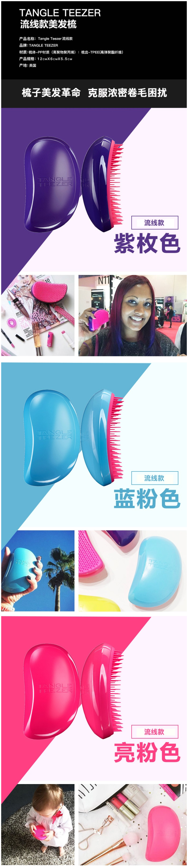这款Tangle Teezer TT王妃梳,非常利于便携,大面积特别的梳齿结构,带来普通梳子不具备的顺发效果,造型完美贴合头皮曲线,起到舒压按摩的作用,防静电材质,不伤头皮,居家旅行携带方便。