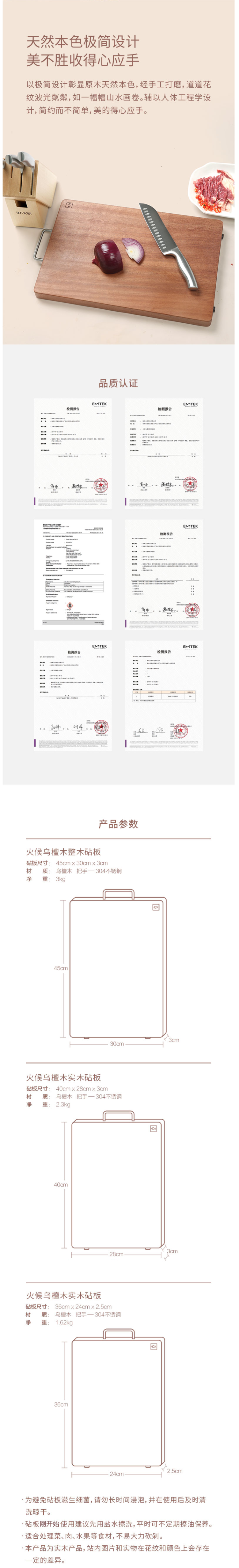 这款火候砧板选用非洲进口乌檀木的木心制作,其结构细腻、纹路均匀、色泽光亮,制成的砧板具有古朴的质感,经久耐用,整木无拼接、无缝隙,所有的配件无螺丝,不易藏污纳垢,易清洗,易打理。