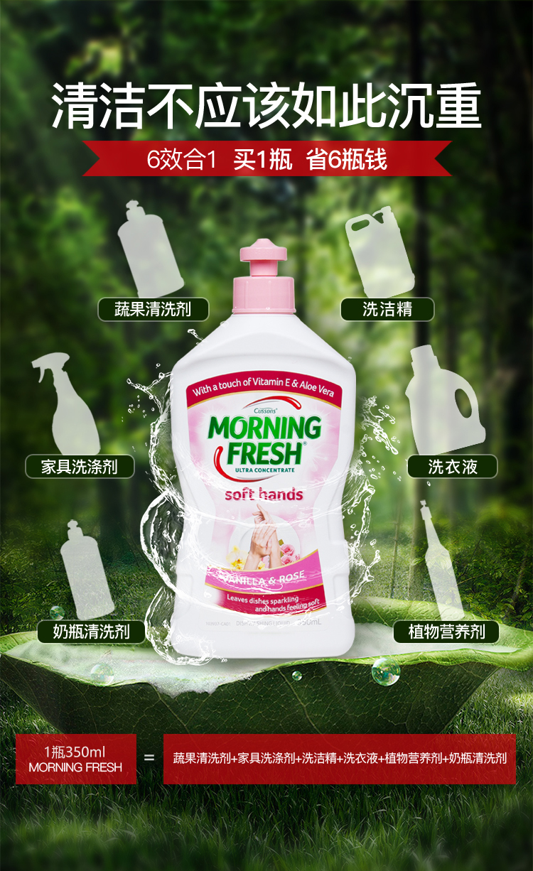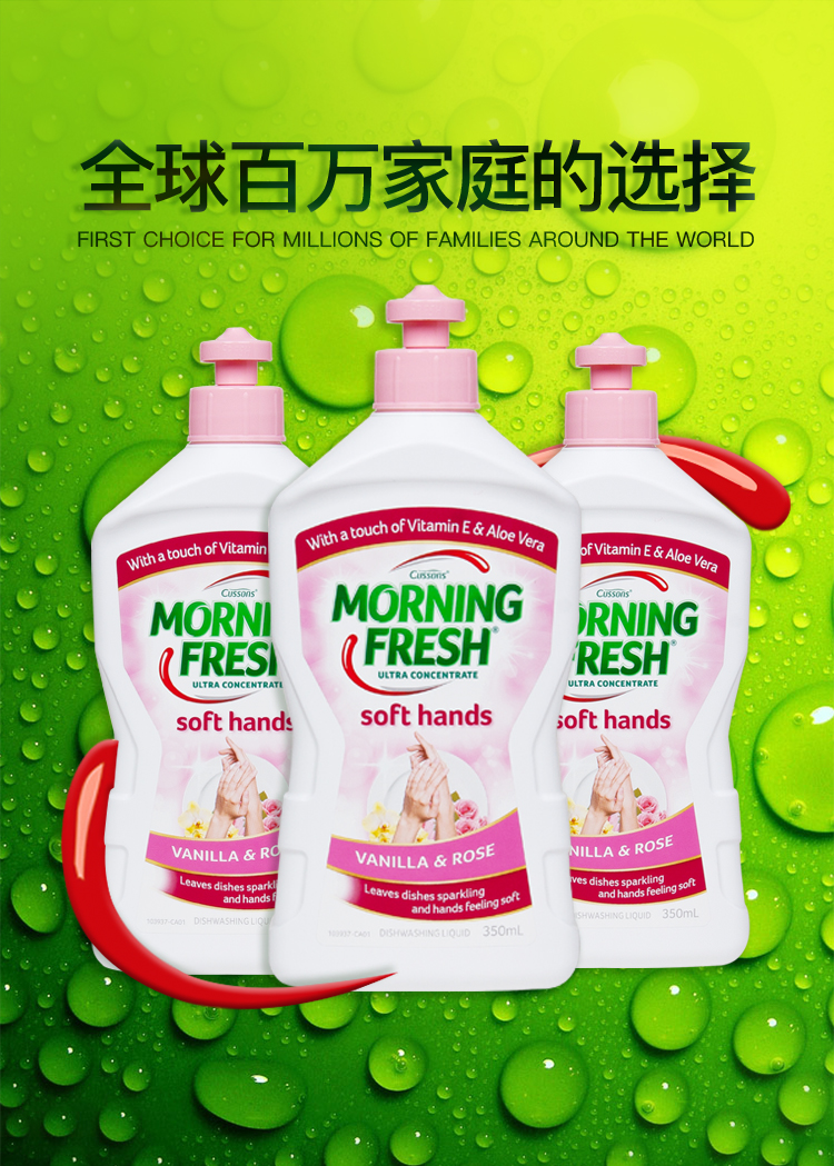 天猫morningfresh旗舰店89元,可领50元优惠券,实付39元到手。这款Morning Fresh 超浓缩洗洁精 玫瑰味350ml*3瓶,高效植物活性剂,成分安全健康,天然洁净力,安全不伤手;只需1~3滴,强力去油污,一瓶可洗3500个碗碟;低泡易清洗,味道清新,温和护手,无残留。