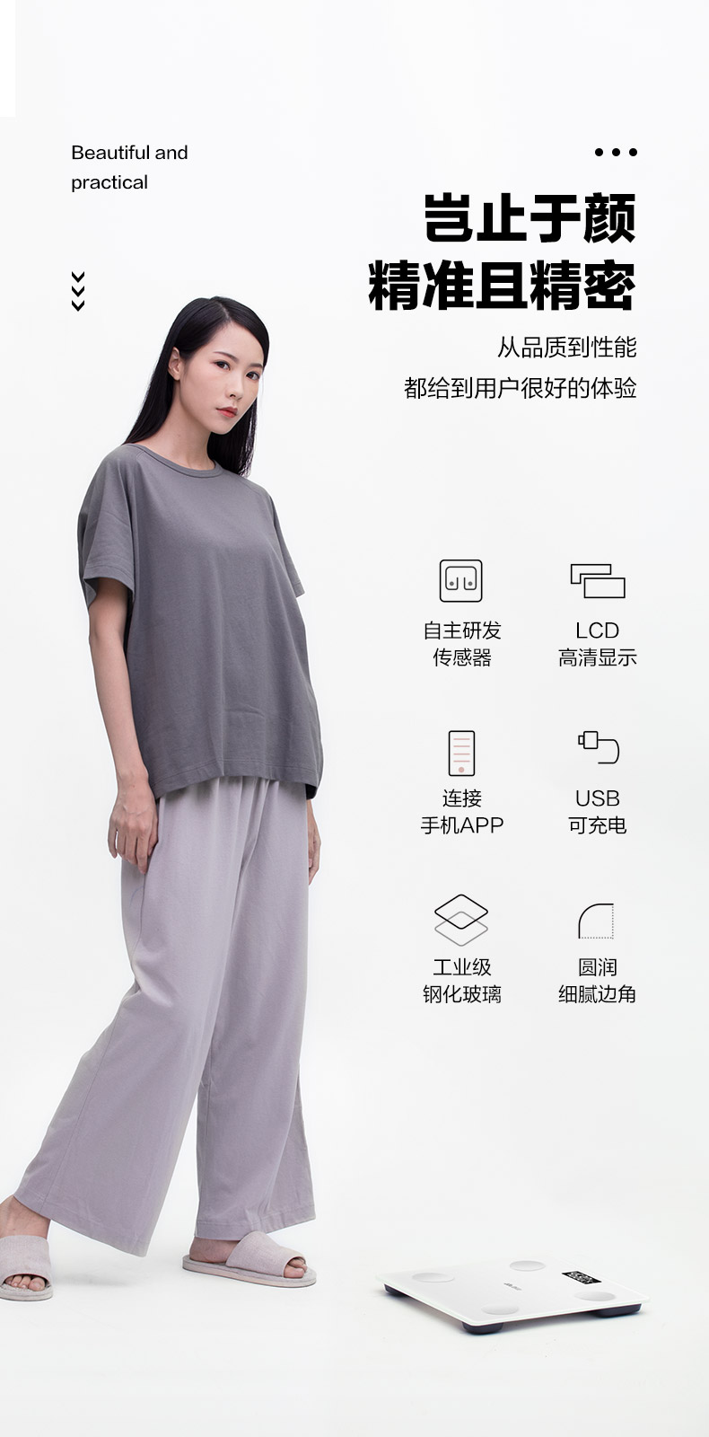 可监测12项身体数据,包括体重、体胖指数、BMI、水分、肌肉指数、蛋白质、身体年龄、基础代谢、活动代谢、骨骼肌量、体型、健康评分,在连接APP时,展现并自动分析你的数据,APP可制定你的瘦身计划和饮食规划,支持IOS和安卓。