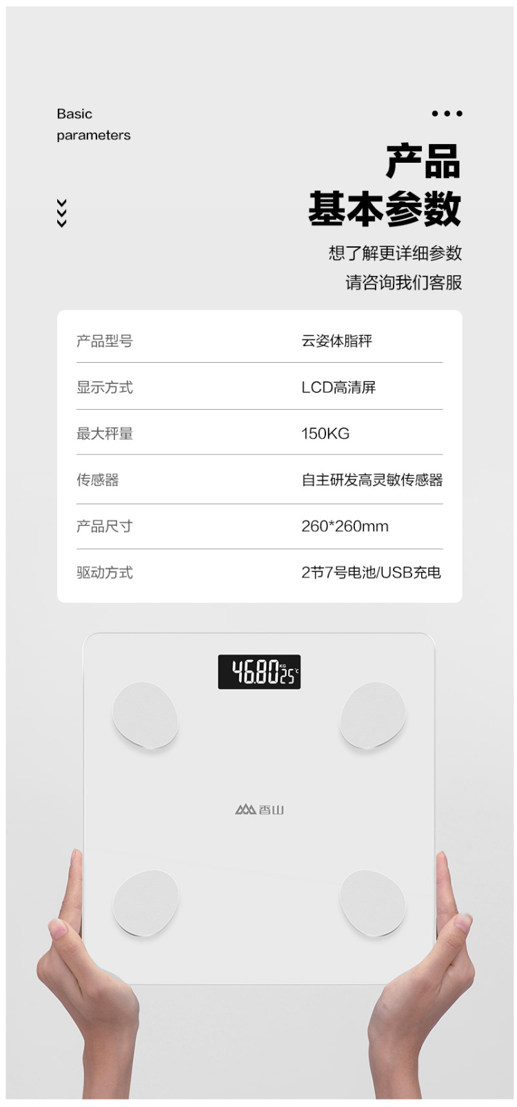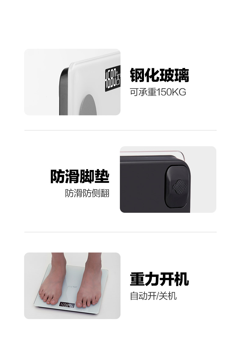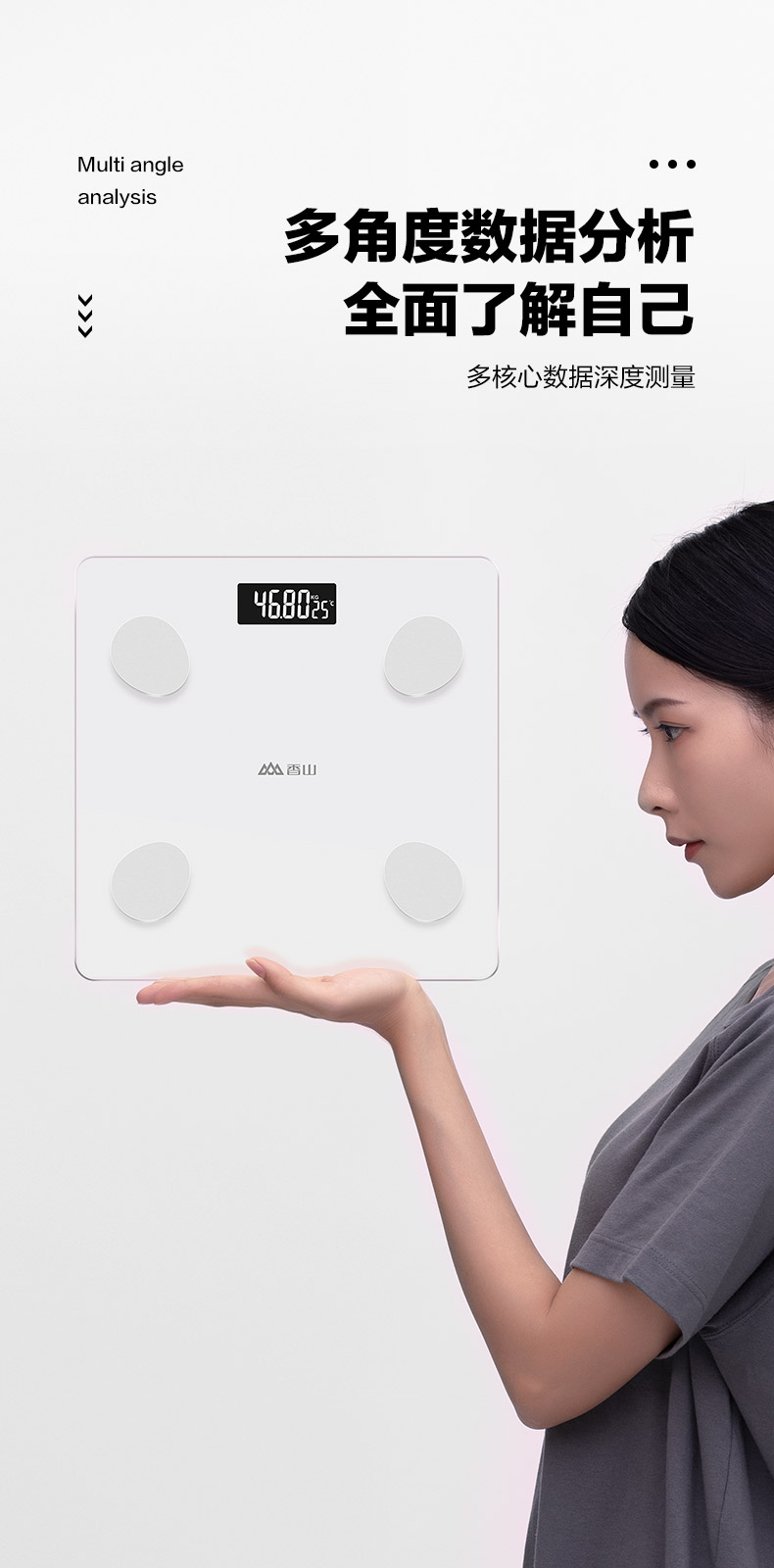 通过香山健康的APP的跟踪记录,可清楚明晰地了解到自己身体状况的变化,并且做出针对性调整。自动开关机,使用智能重力感应,上秤自动给开机,下秤自动关机。高硬度钢化玻璃表面,LED液晶显示,体重精确到0.1kg。尺寸29*26cm。