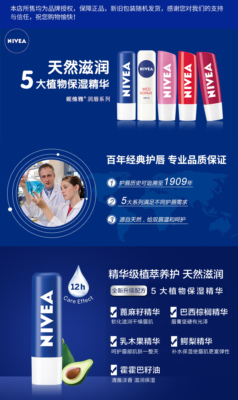 这款妮维雅男女唇膏,使用温和滋润配方—蓖麻子精华、乳木果精华、霍霍巴籽油、巴西棕榈精华、鳄梨精华,保湿不黏腻,无色无味不含香精。