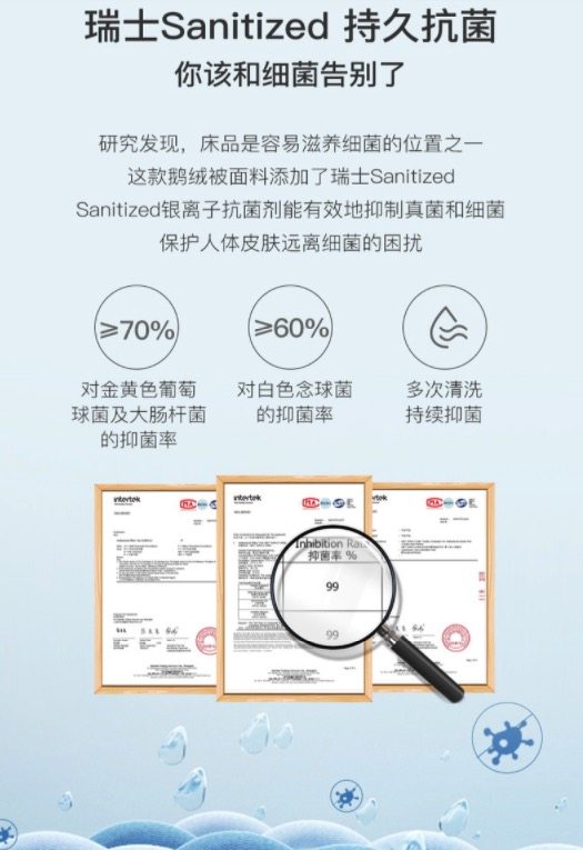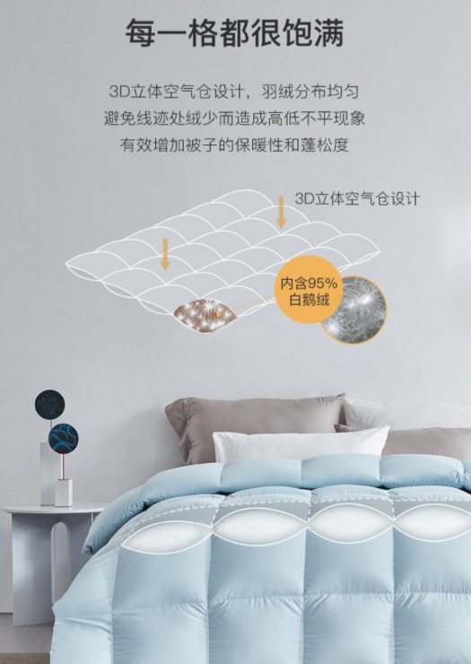 3D立体空气仓设计,全自动充绒机填充,确保每一格羽绒分布均匀饱满,后期光照台检验,防止异物混入,有效增加被子的保暖性和蓬松度。面料添加了瑞士Sanitized银离子抗菌剂能有效地抑制真菌和细菌