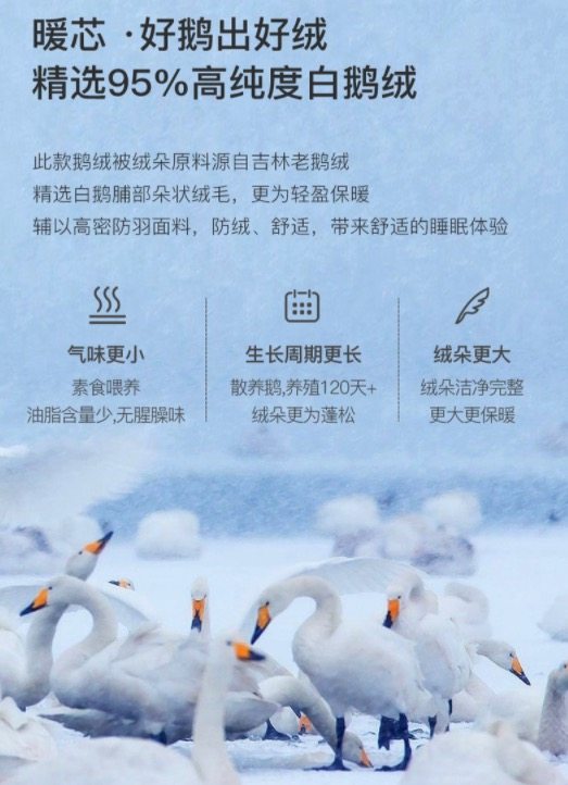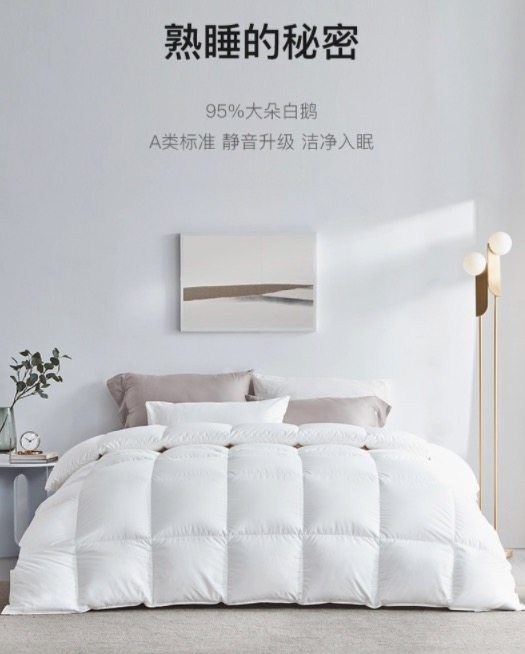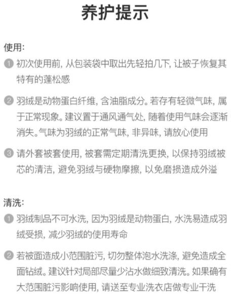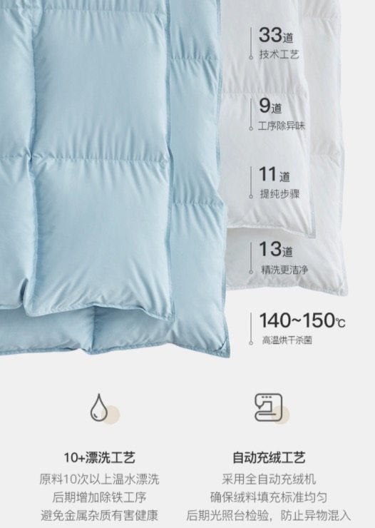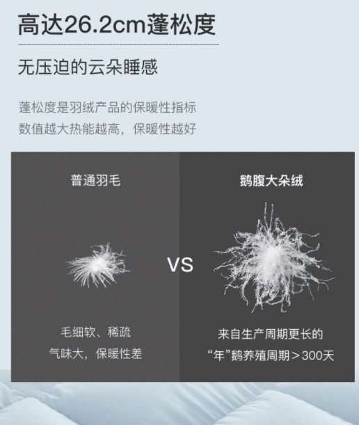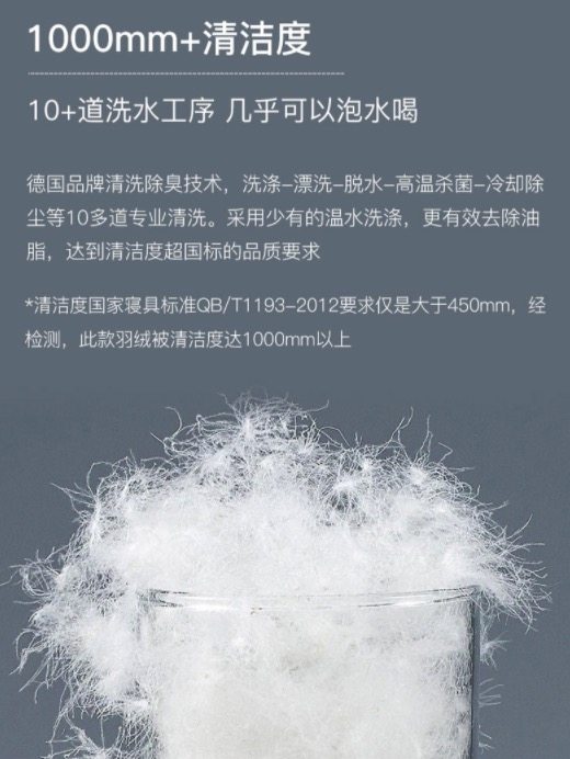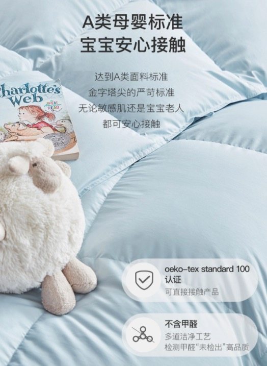 这款羽绒被,甄选白鹅腹部大绒朵绒毛,含绒量95%,高达26.2cm蓬松度,历经10+次专业清洗杀菌除臭工艺,不含甲醛,清洁度达1000mm以上,A类母婴及标准,远高于国家寝具标准QB/T1193--2012要求仅是大于450mm。oeko--tex standard 100 全球纺织品安全资质认证。