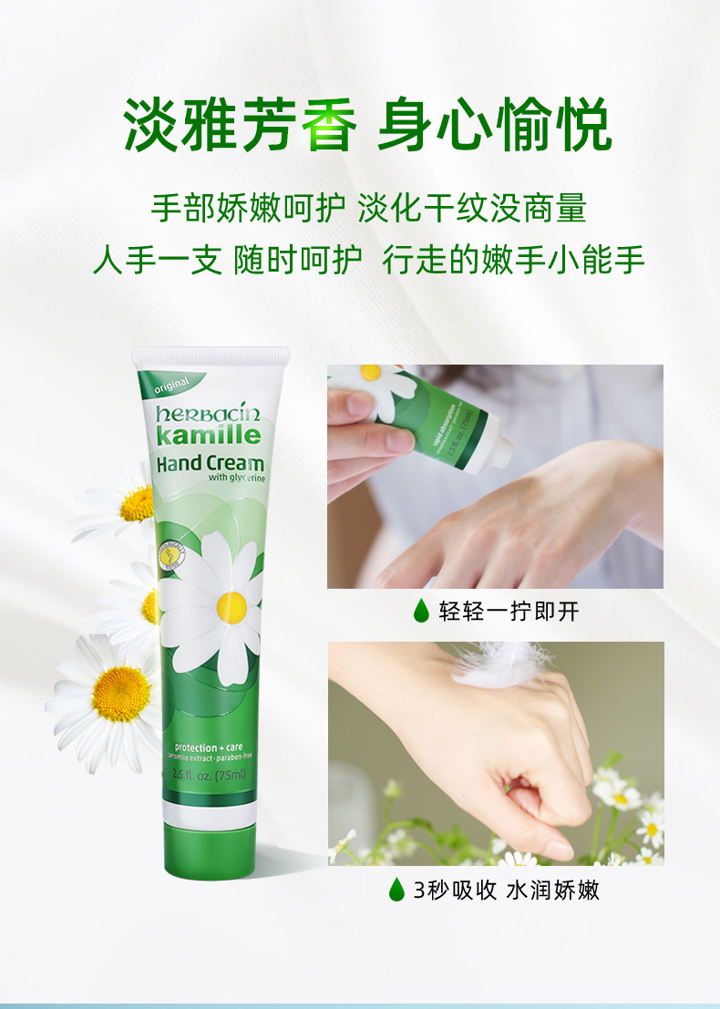 这款小甘菊 补水滋润手足霜,德国原装进口,采用德国洋甘菊萃取精华和荷荷巴油,能软化角质深入修护肌肤,补水持久保湿,洋甘菊精华能舒缓秋冬敏感肌。