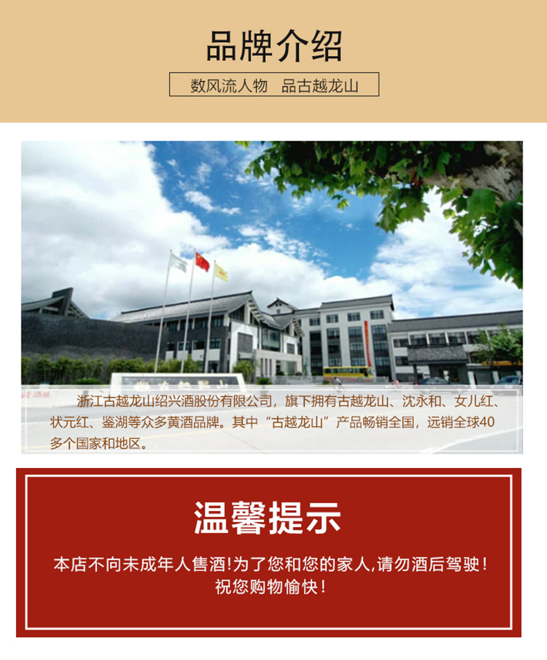 绍兴黄酒是中国的民族特产,也称为米酒(ricewine), 属于酿造酒,在世界三大酿造酒(黄酒、葡萄酒和啤酒)中占有重要的一席。古越龙山是黄酒中的“国酒“,黄酒市场中的古越龙山就象白酒市场中的茅台,酿酒技术独树一帜,成为东方酿造界的典型代表和楷模。