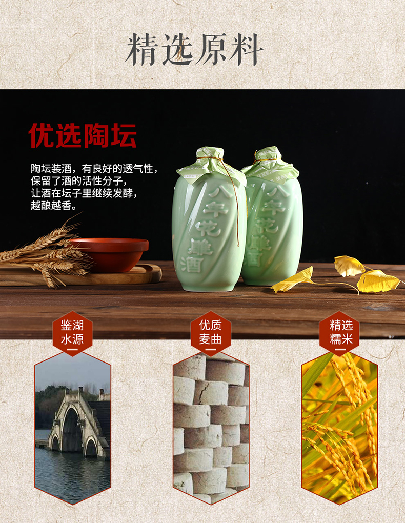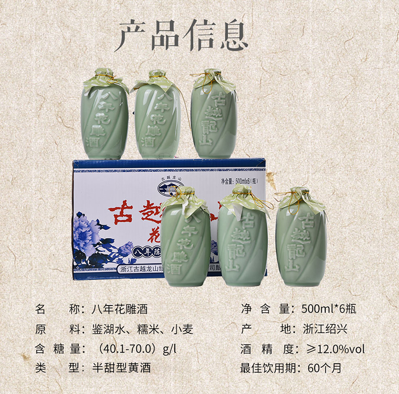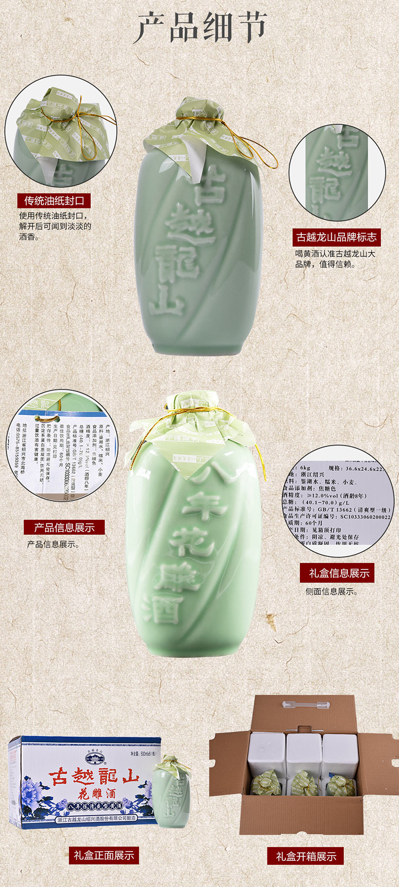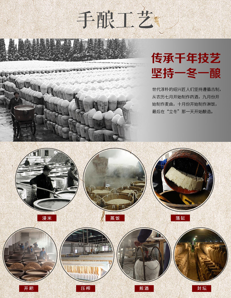 这款古越龙山绍兴黄酒,以糯米、小麦、鉴湖水为原料,使用传统的酿制技艺,农历七月制酒药,八、九月制麦曲,小雪做酒酿,大雪前后投料开酿,用独特的复式发酵工艺发酵90余天,翌年立春开始压榨、煎酒,然后泥封贮藏。
