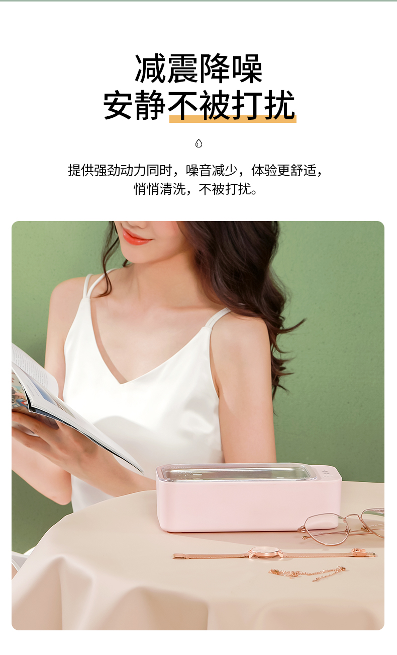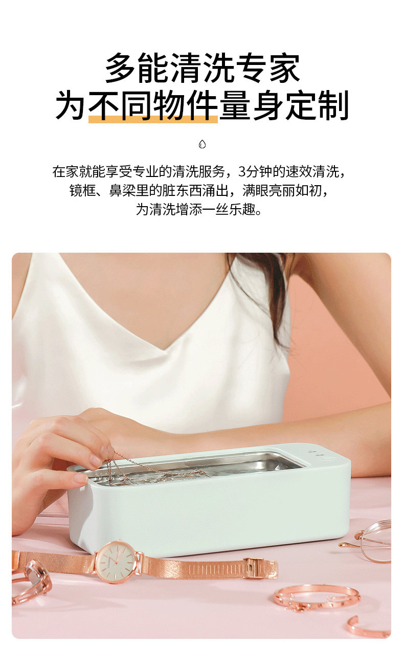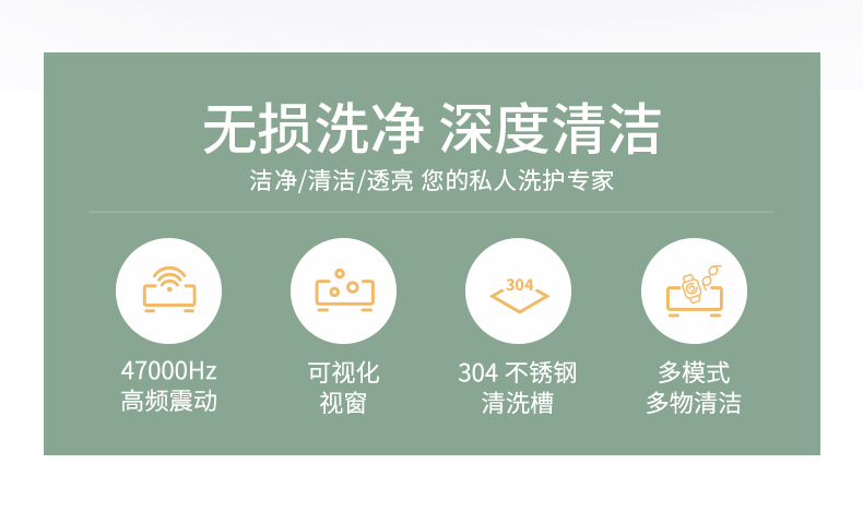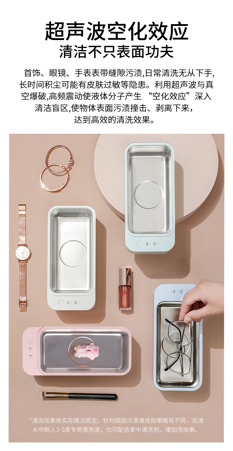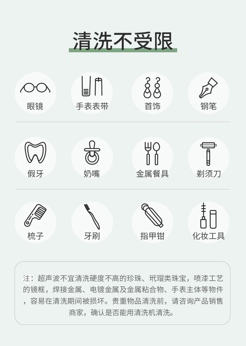 注:超声波不宜清洗硬度不高的珍珠、玳瑁类珠宝,喷漆工艺的镜框,焊接金属、电镀金属及金属粘合物、手表主体等物件,容易在清洗期间被损坏。贵重物品清洗前,请咨询产品销售商家,确认是否能用清洗机清洗。