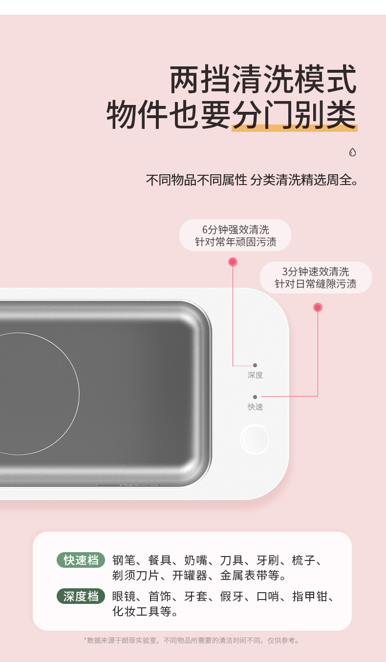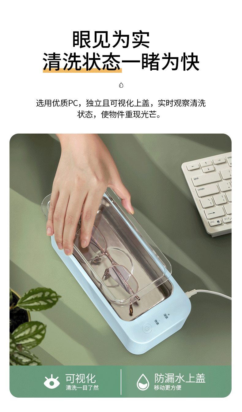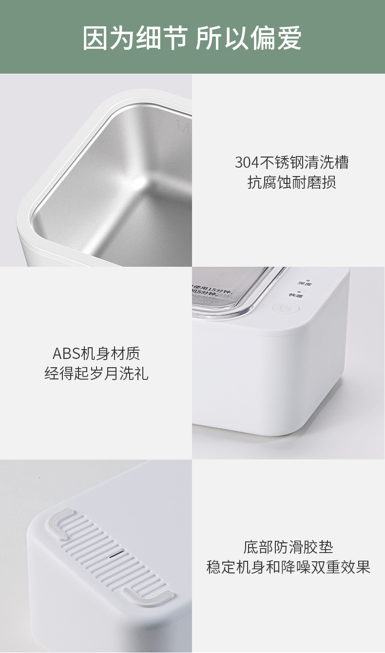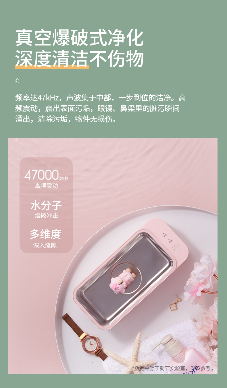 注:超声波不宜清洗硬度不高的珍珠、玳瑁类珠宝,喷漆工艺的镜框,焊接金属、电镀金属及金属粘合物、手表主体等物件,容易在清洗期间被损坏。贵重物品清洗前,请咨询产品销售商家,确认是否能用清洗机清洗。