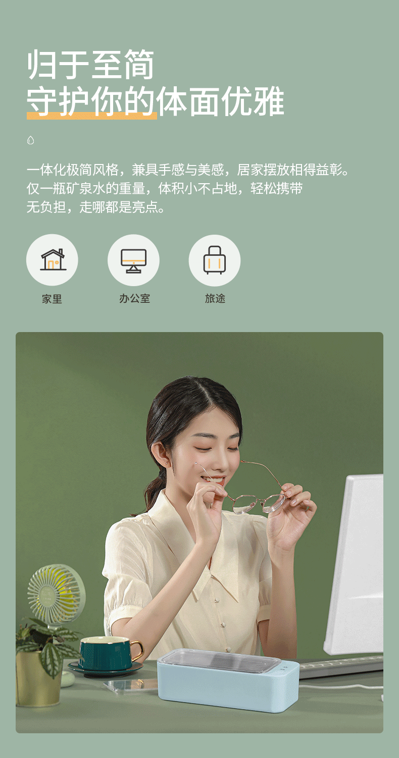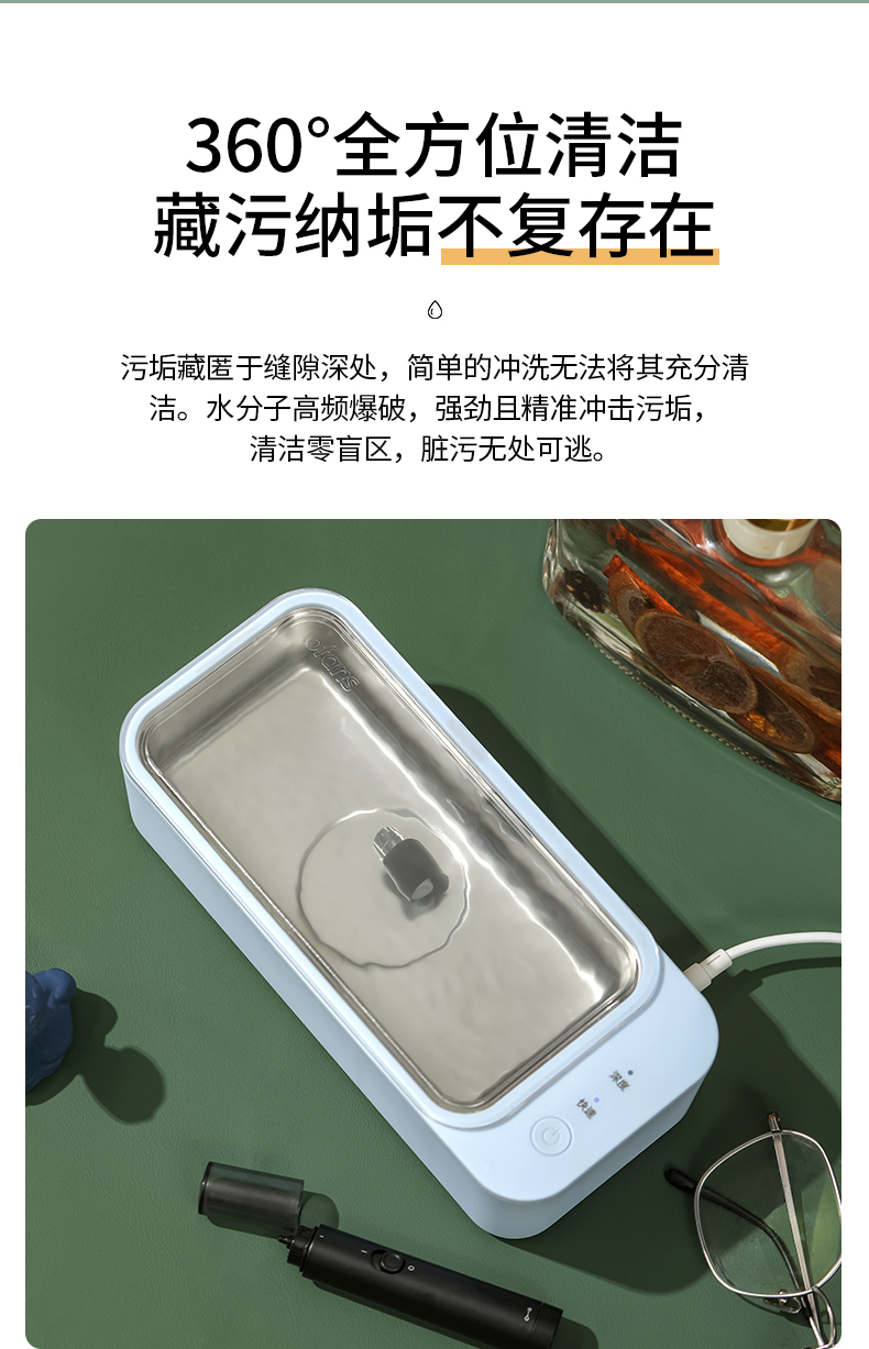 小米生态链 朗菲超声波清洗机,可视化开盖设计,350ml容量,45000Hz的震动频率,使液体中的空气和水分离,形成微气泡,在声压作用下膨胀破裂,瞬间的冲击力不断冲刷物体,多维度深入缝隙、凹槽、及死角,使物体上的油脂、灰尘、细菌等剥离,不损伤物件同时达到清洁效果,令物体表面光泽如新。