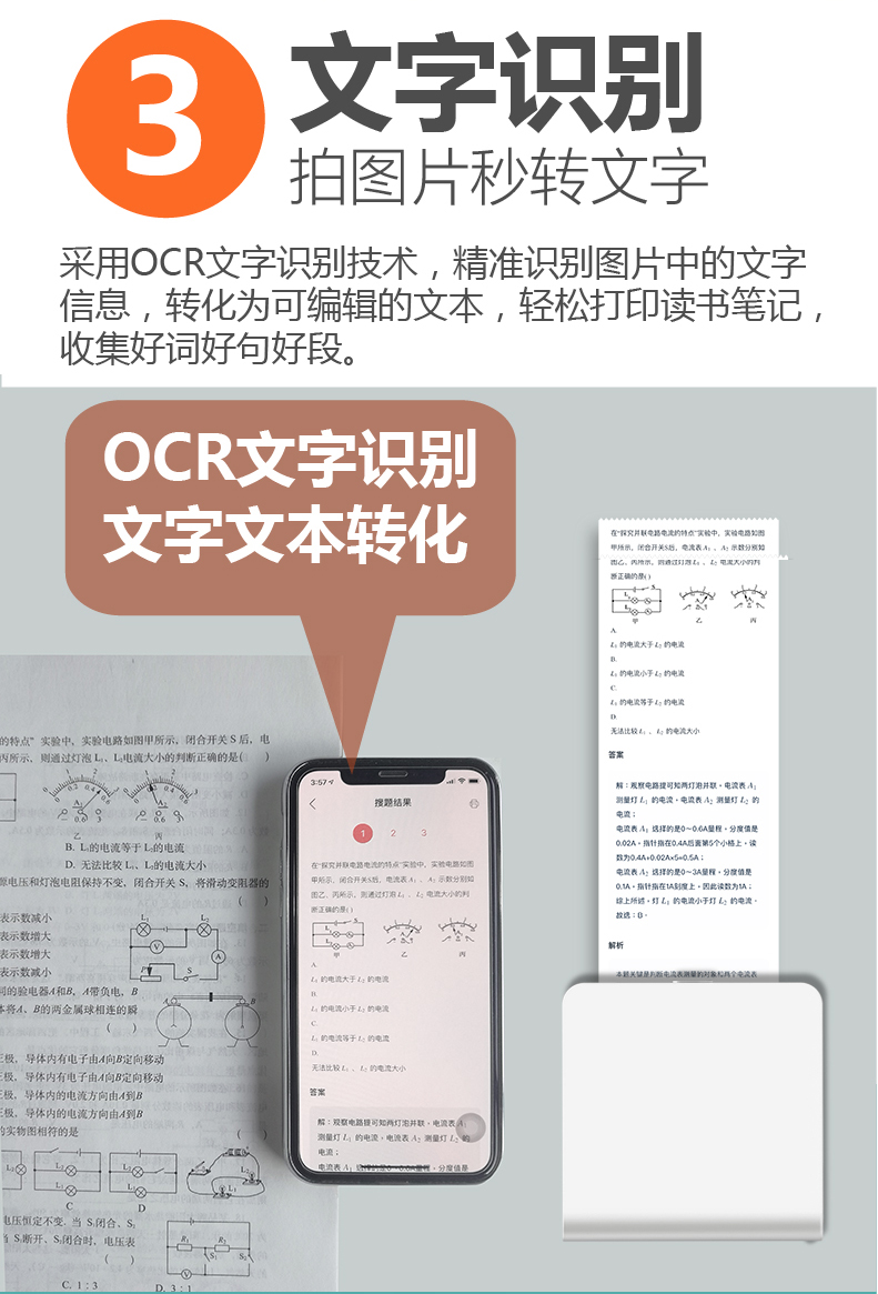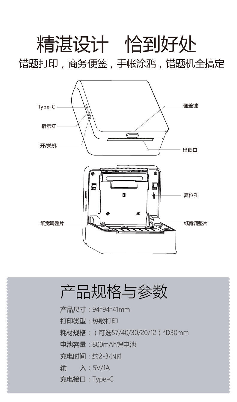 学生错题打印机,小巧便携,蓝牙直连,无需添加油墨,环保健康,省钱省心,内800mAh锂电池,续航持久;海量题库,涵盖小学到高中所有科目、大学主要科目,遇到难题随手一拍,秒出答案;把错题打印出来粘贴在错题本上,不用手抄,方便复习。