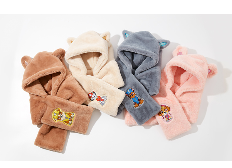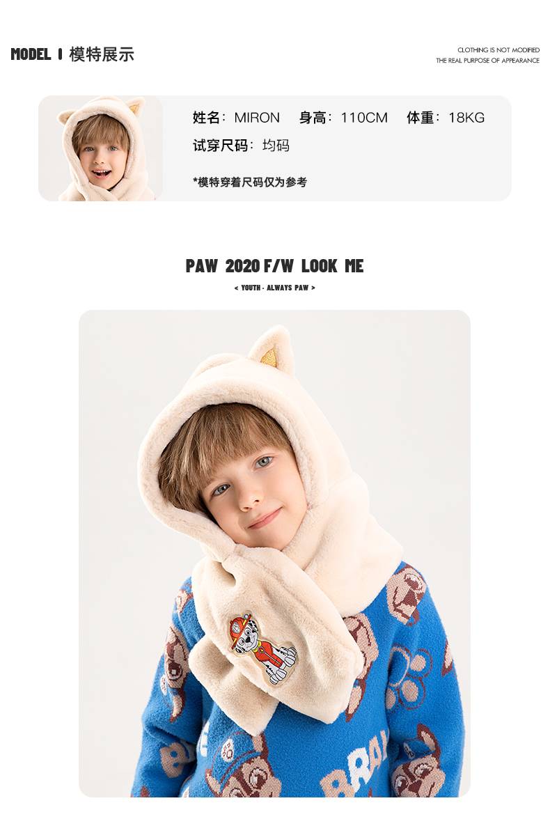 这款PAW PATROL 汪汪队立大功 2020新品 儿童秋冬围巾一体毛绒帽子,双面仿懒兔毛面料,温暖不掉毛,超细绒毛,婴儿般触感。立体帽型剪裁,小动物耳朵装饰,新颖别致,非常亮眼,搭配汪汪队狗狗专属织章设计刺绣,童真可爱。