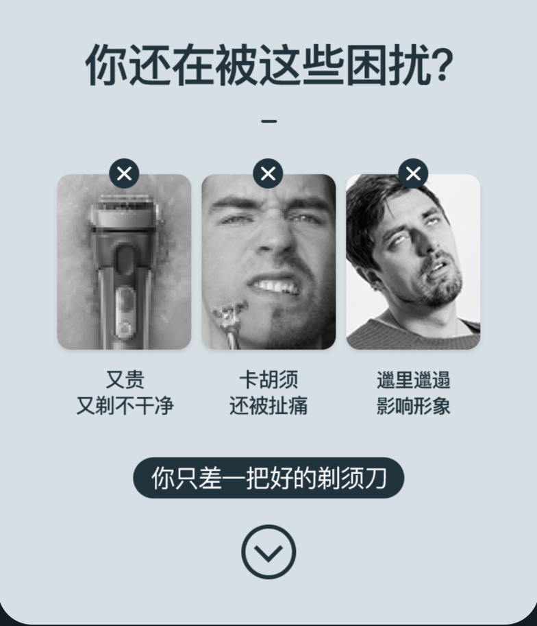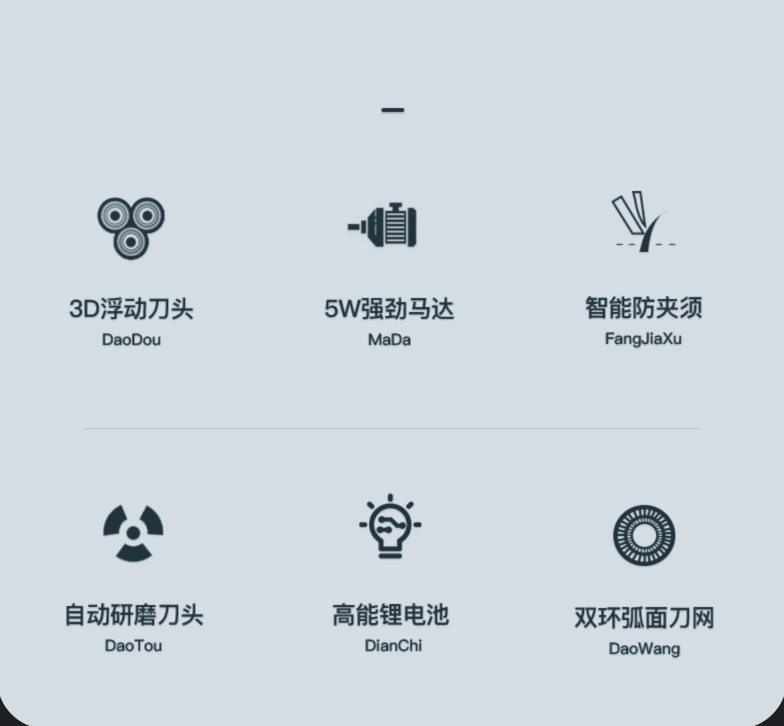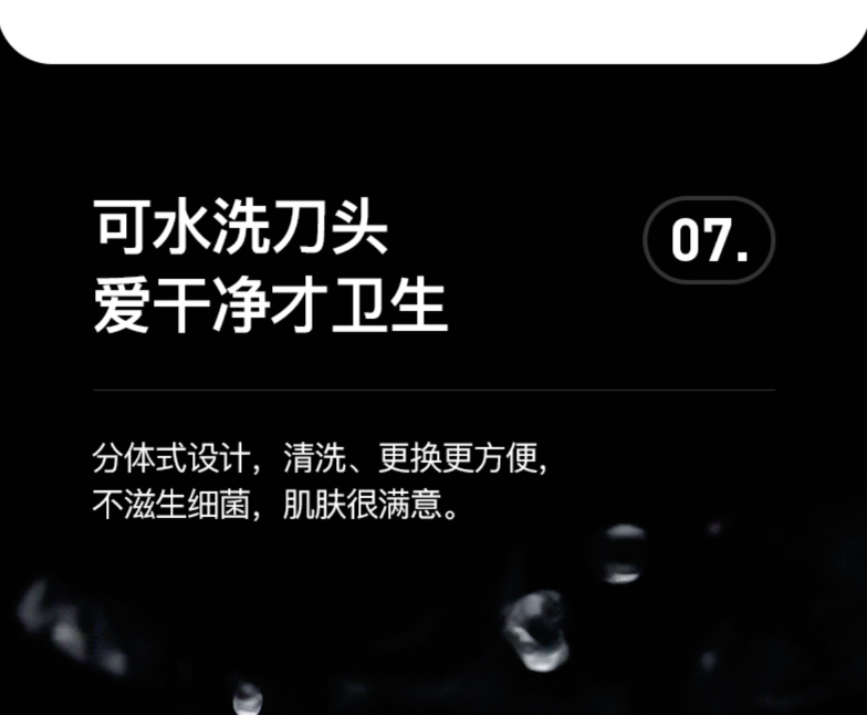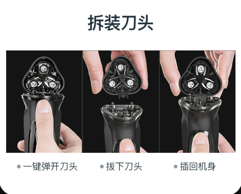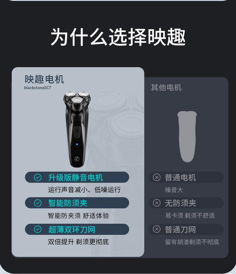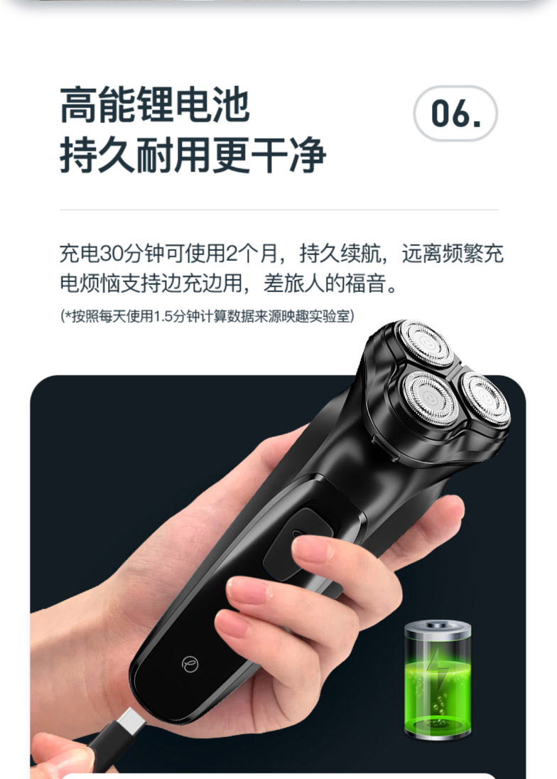 这款映趣电动剃须刀,电动全身水洗干湿两用,三组独立浮动刀头,比普通双刀头增加1/3剃须面积。超薄双环刀网设计,剃须效率双倍提升。智能防夹须,LED电量显示。5W大功率,充电1小时续航2个月。 自动研磨刀片,分体式设计,刀头可轻松取下水洗。