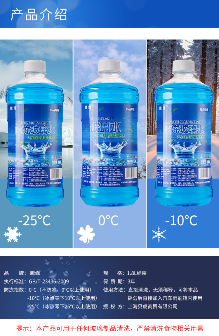 本款产品可以直接清洗,无需稀释,将玻璃水摇匀之后倒入汽车雨刷箱使用。其主要成分为去离子水、表面活性剂、防腐剂,能够清洁去污,不留水痕,快速渗透,强力去污,有效去除汽车玻璃上的雾膜、冰雪、手印以及虫胶等污垢,且能较快蒸发不留痕迹,让车主视野清晰,给你带来从未体验过的去污效果。经过SGS RoHS环保测试,品质值得信赖。