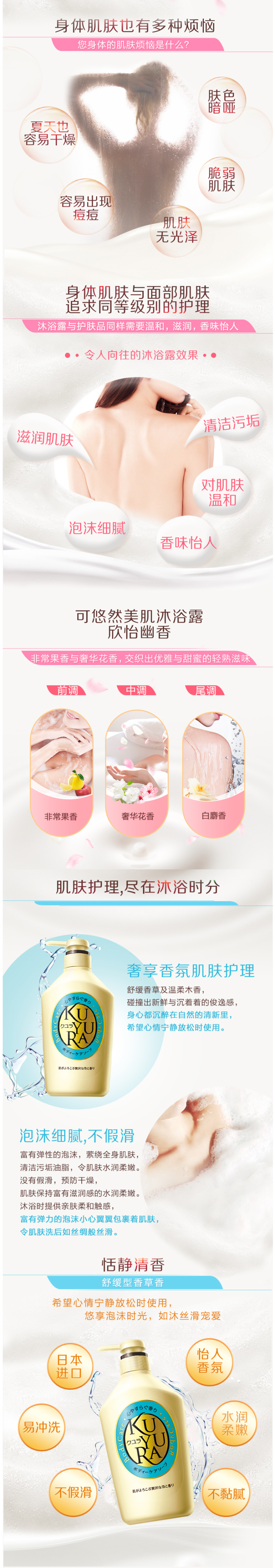 可悠然KUYURA,是资生堂集团旗下的原装进口沐浴露品牌,创立于2008年,含有肌肤护理成分的香芬及泡沫萦绕全身并清洁肌肤,让身体肌肤拥有与面部肌肤同等级别的护理。