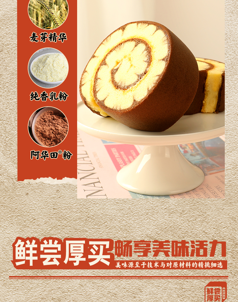 阿华田新品的蛋糕卷,精选优质小麦粉和新鲜土鸡蛋,搭配香醇乳粉和经典麦芽蛋白阿华田可可粉,新鲜制作,具有丝滑细腻的口感,单个便携独立包装,食用方便,很不错的小零食。