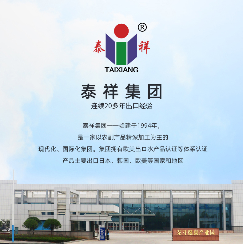 泰祥集团是一家以农副渔产品为原料进行精深加工的企业,拥有欧美出口水产品认证等体系认证。2004年“泰祥”商标被评为山东省著名商标、荣获AAA级信誉企业称号。并于2013年被选为“山东省非物质文化遗产”。目前,泰祥鲅鱼水饺现已出口到澳大利亚、荷兰、比利时、德国、英国、韩国等国家和地区。