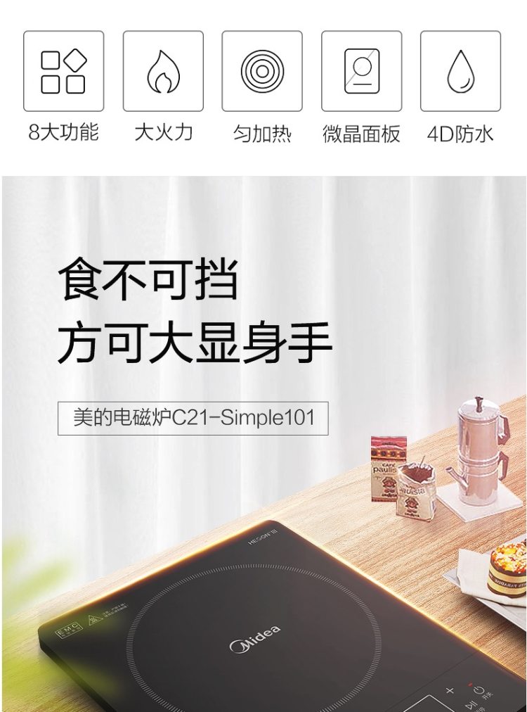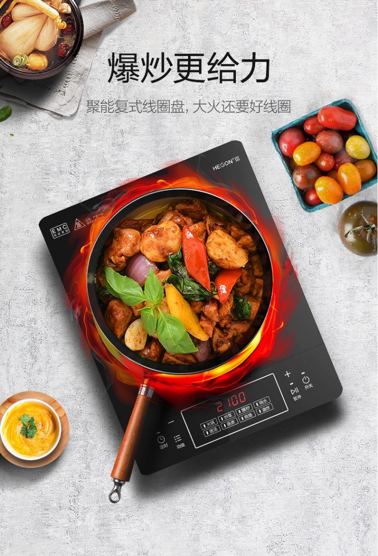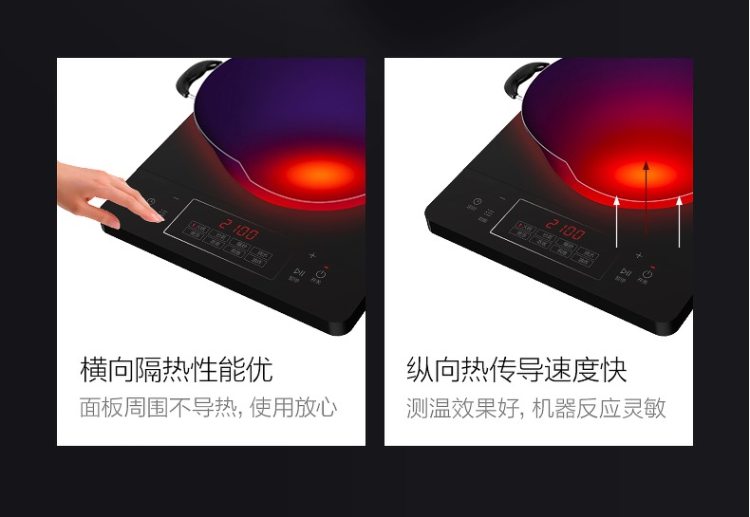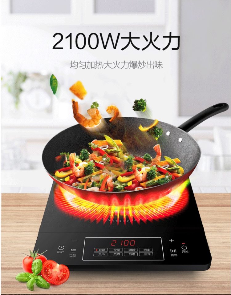 这款电磁炉采用聚能双层复试线圈盘,高导磁条传能更迅速,2100W大火力设计,匀速加热,可以大火力爆炒。