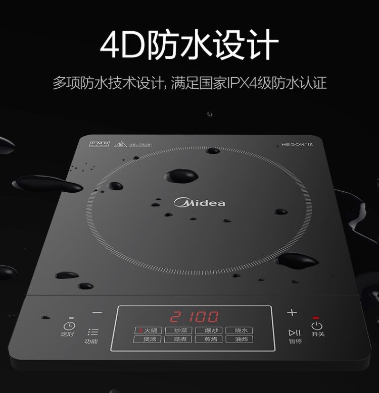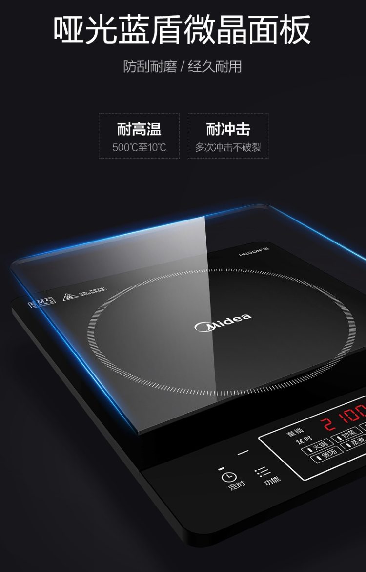 表面覆盖哑光蓝盾微晶面板,耐高温,耐冲击,防刮耐磨,且不向面板周围导热,使用起来比较放心,IPX4级防水,防任意角度的水泼溅,无惧溢水,搭载美家安全防护4.0系统,防高温、防低温、防干烧、防堵塞、防漏电、防传感器失效,使用起来非常安全,且130V-270V电压均可适用,使用更省心。