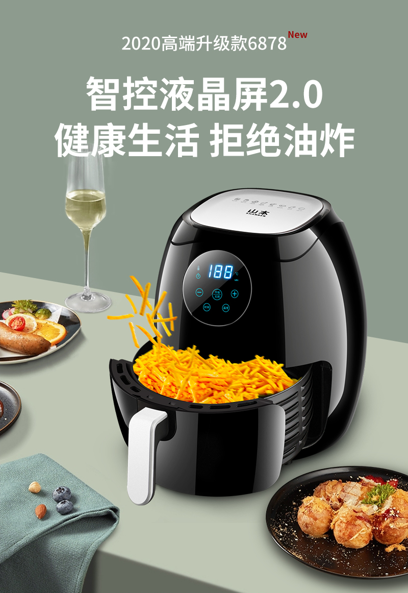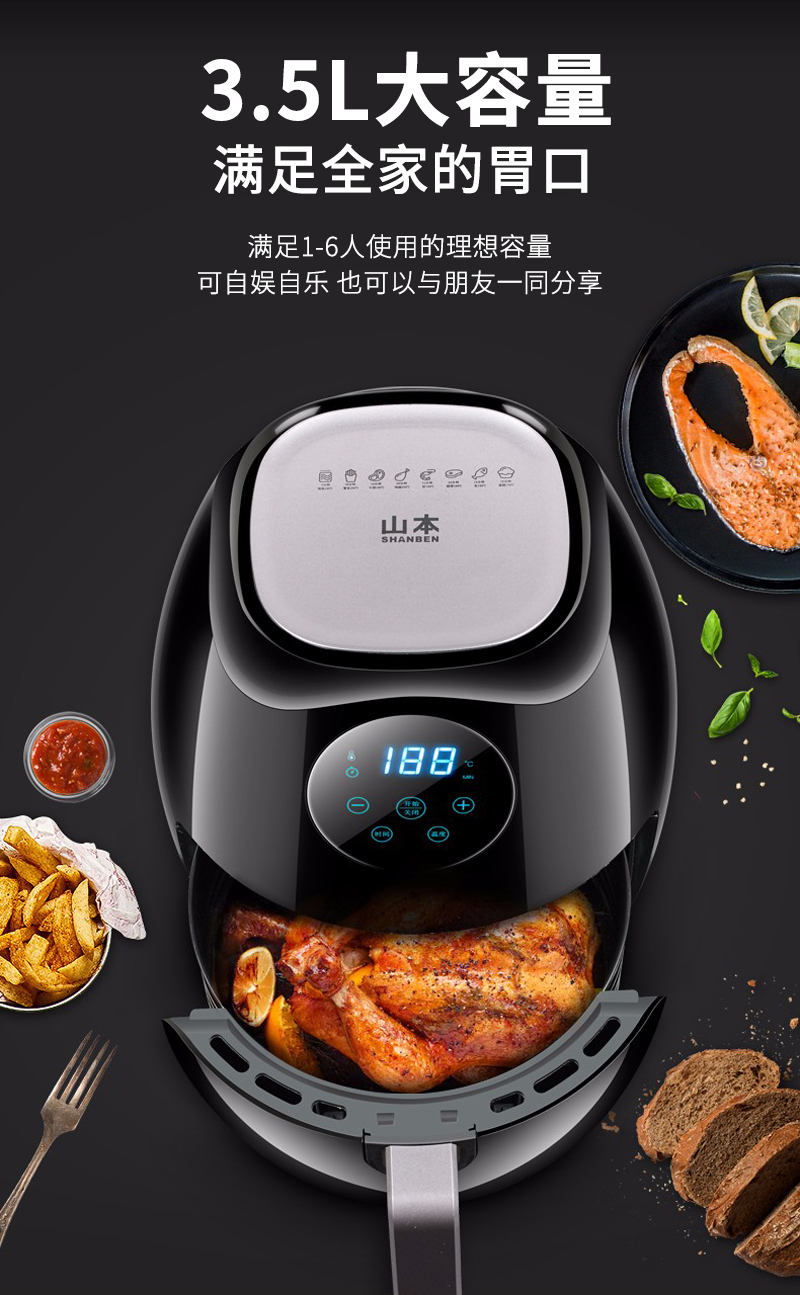 这是山本的升级款空气炸锅,容量4L,可无油煎炸、烘焙、烧烤等,功能齐全,同时无油更健康。采用高速空气循环技术,利用食物本身的油脂,360度气体加热渗透,轻松烹饪健康美食;智能操作,可调节温度和时间,一体式导风槽内胆,外层采用不粘锅涂层,清洗方便,经久耐用。