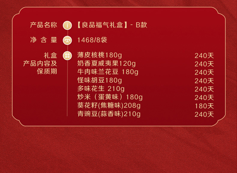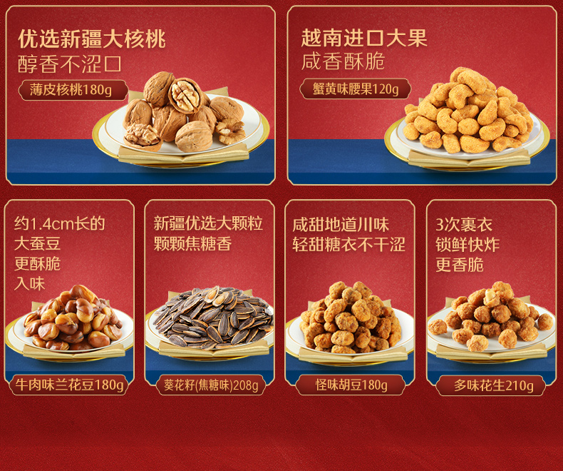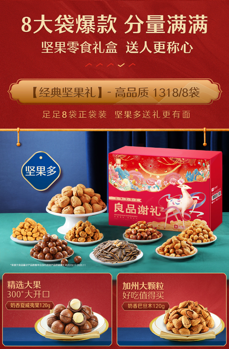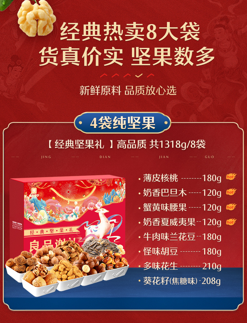 8大包,巴旦木,夏威夷果等多样坚果,你爱吃的他都有,他家线下一袋至少都得10块以上!这包装,这档次!送人自留都很不错!