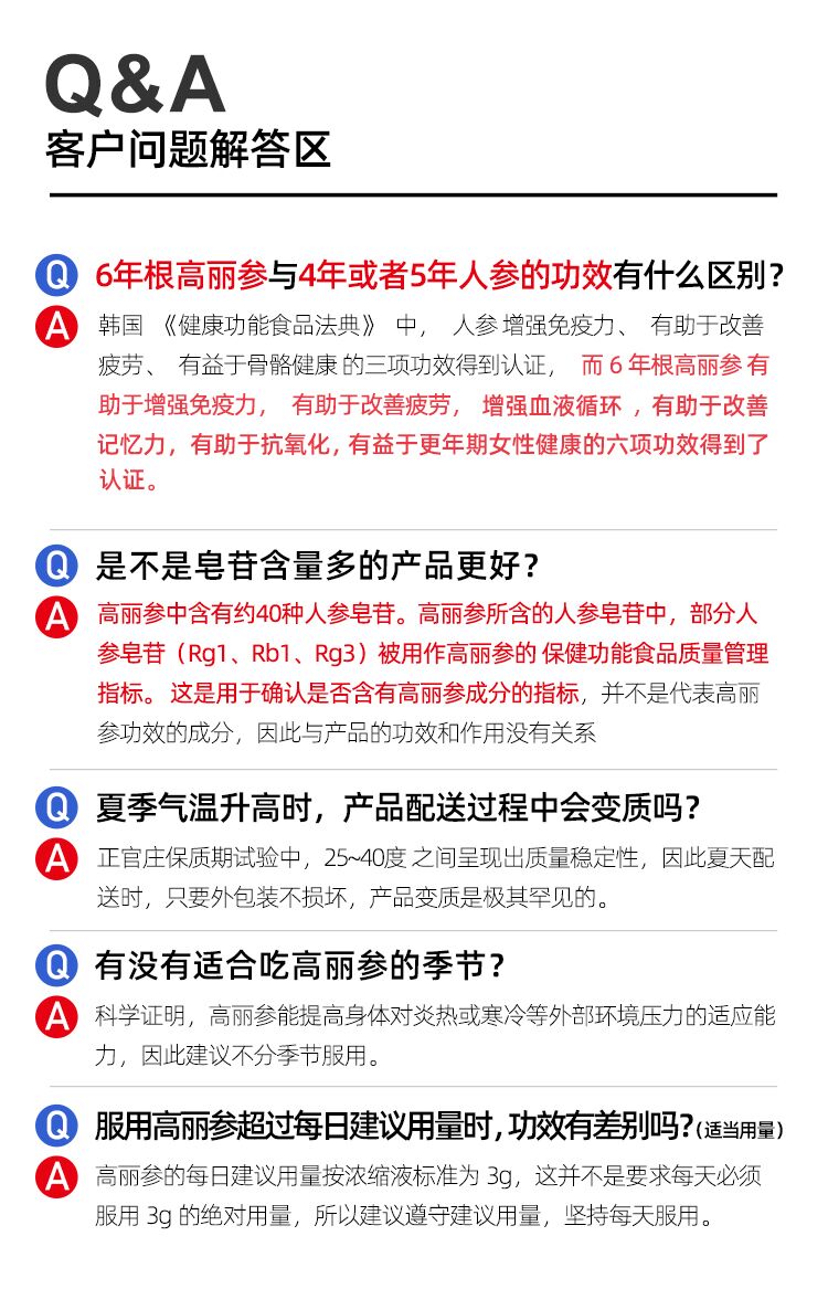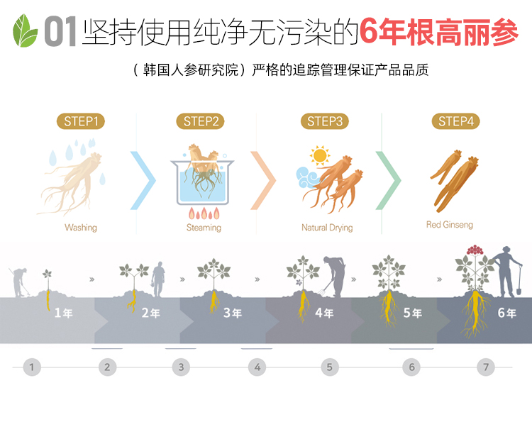红参:采用采用6年根高丽根高丽人参,富含32种皂苷,采用超微细粉末技术及发酵红参制造技术,强化皂苷含量、提高吸收率,有助于增强血液循环,改善疲劳,增强免疫力。