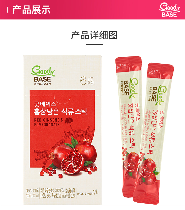 这款正官庄高丽参石榴浓缩液,韩国原装进口,由石榴果汁浓缩液 11.8%、高丽参浓缩液0.2%、纯净水为原料制成,能改善新陈代谢,提高抵抗力增强体质、净化机体美容养颜、滋补健康延缓衰老。