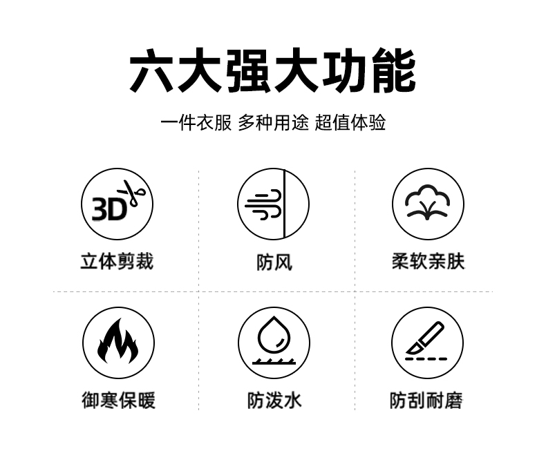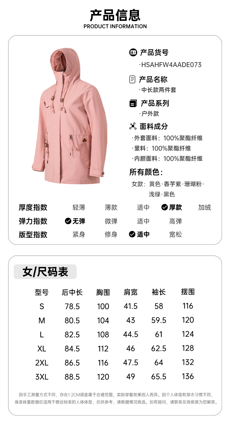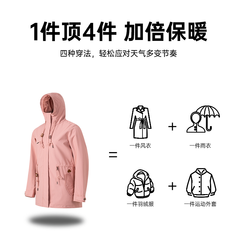 外层是100%聚酯的功能防护面料,具有防风、防水、耐磨的优点,有三合一系统,可与自家的内胆搭配穿。
