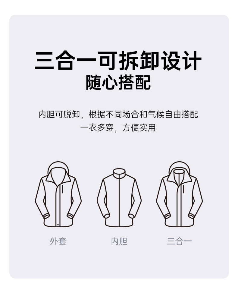所谓的三合一冲锋衣其实是两件衣服,外层是带三合一系统的冲锋衣,具有防风防水功能;里面是一件抓绒,可通过拉链与外层冲锋衣拉在一起,当成一件穿,这样保暖最好。外层冲锋衣与抓绒也都可单穿,比较灵活。