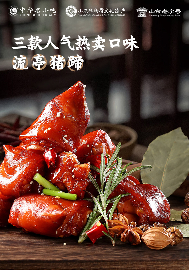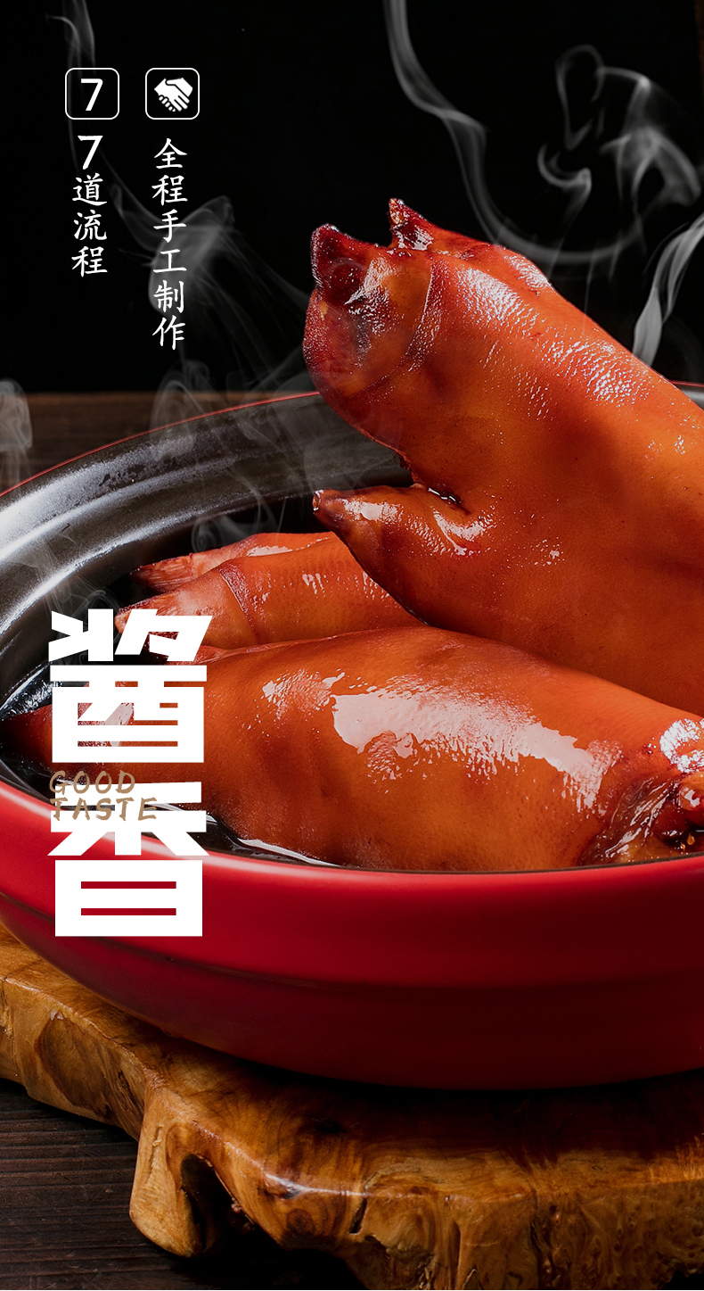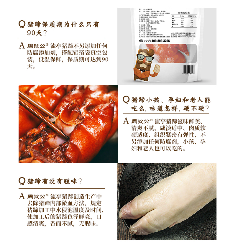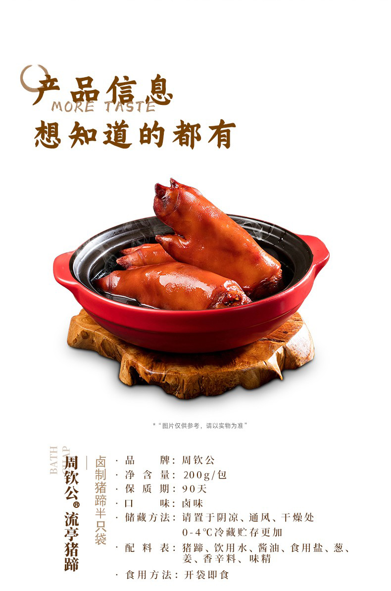 周钦公的流亭猪蹄色泽鲜亮、味道鲜美、清爽不腻、咸淡适中,肉质软硬适度、组织紧密有弹性、无任何防腐添加剂。官方店铺销售,收到猪蹄后0-4度保鲜,不可以放冷冻,不可轻易加热,会影响口感,一个一袋。