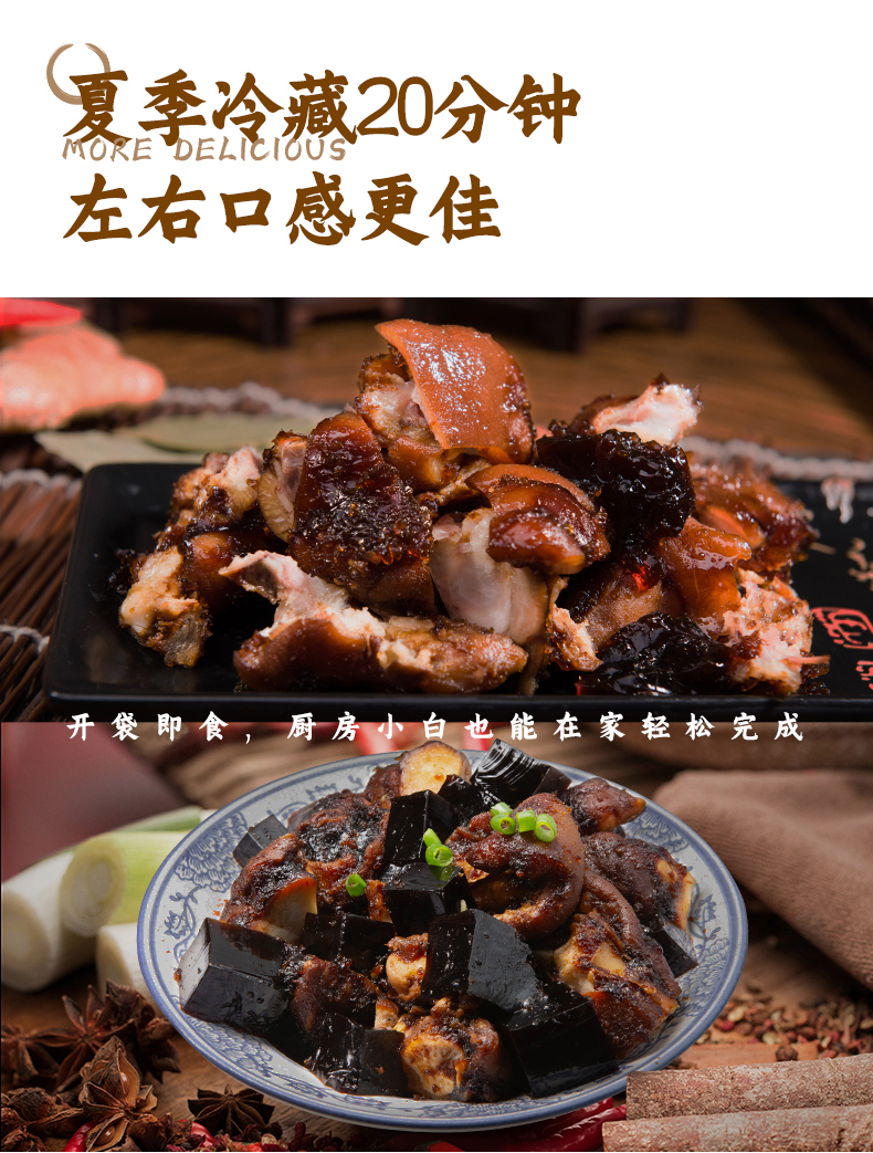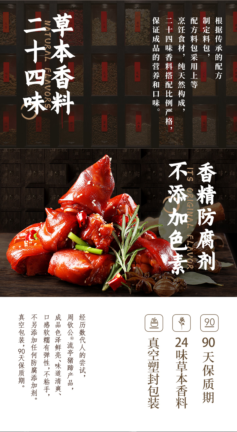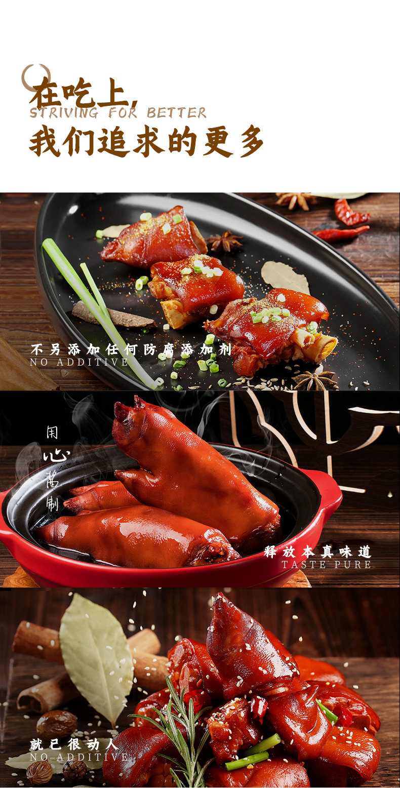 周钦公的流亭猪蹄色泽鲜亮、味道鲜美、清爽不腻、咸淡适中,肉质软硬适度、组织紧密有弹性、无任何防腐添加剂。官方店铺销售,收到猪蹄后0-4度保鲜,不可以放冷冻,不可轻易加热,会影响口感,一个一袋。