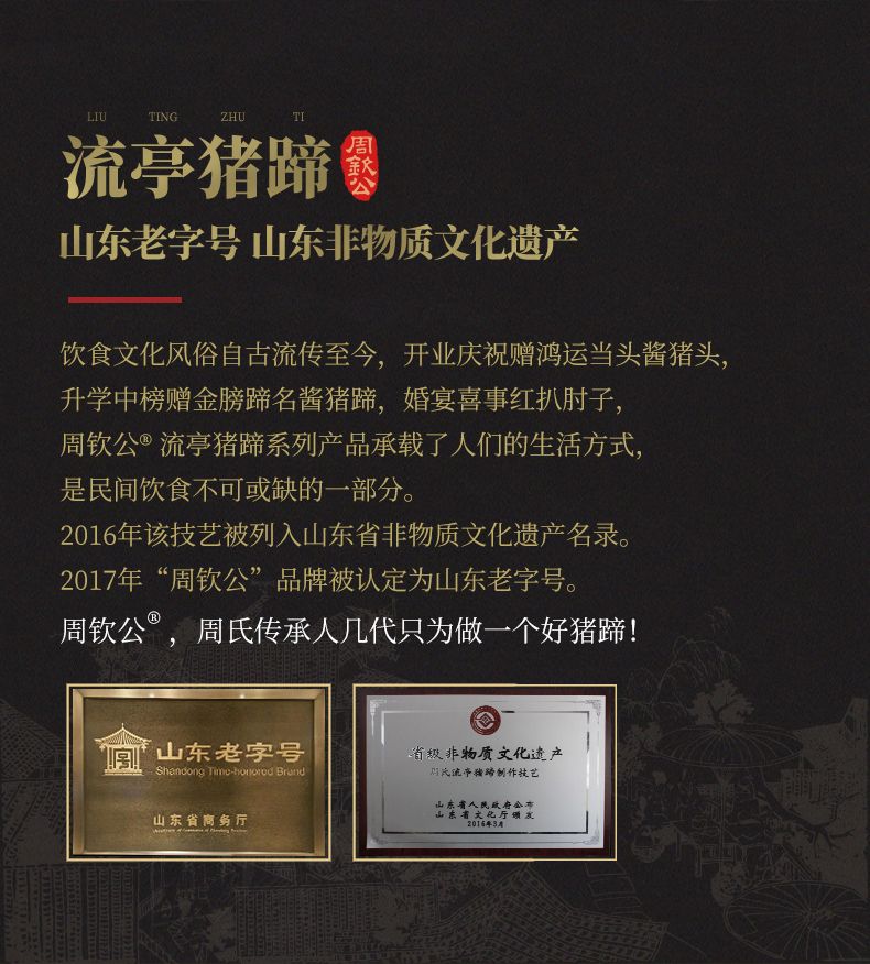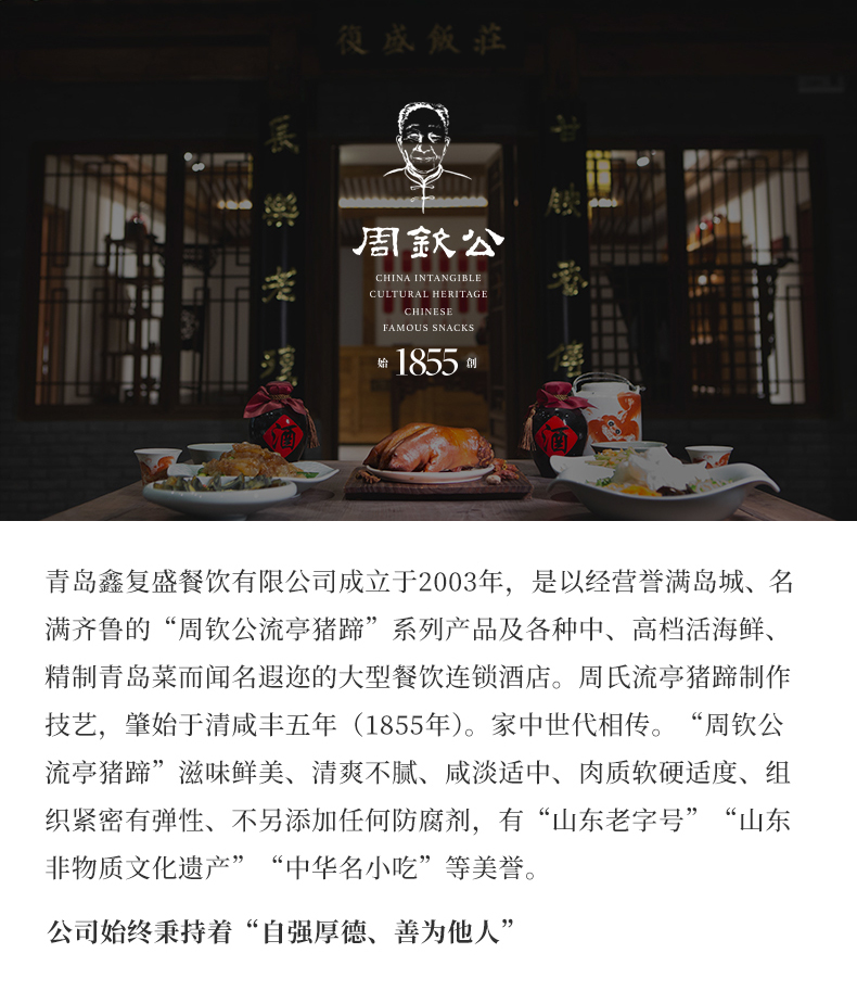 流亭猪蹄创始及成名于清咸丰年间(约1855年前后),至今已有150多年的历史。周钦公流亭猪蹄是最正宗的流亭猪蹄,是祖传流亭秘制猪蹄第四代传人。