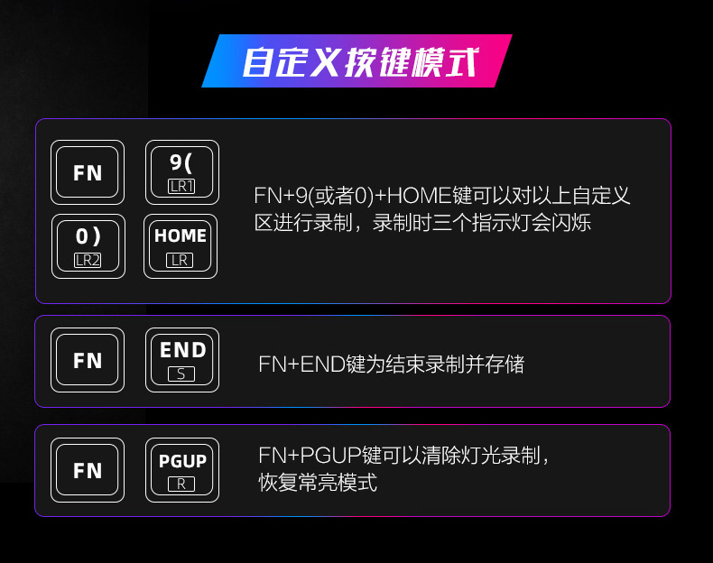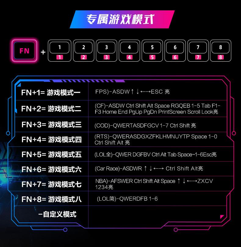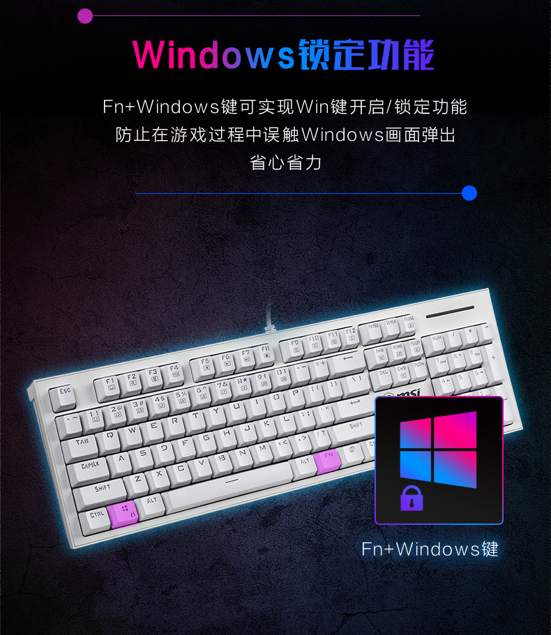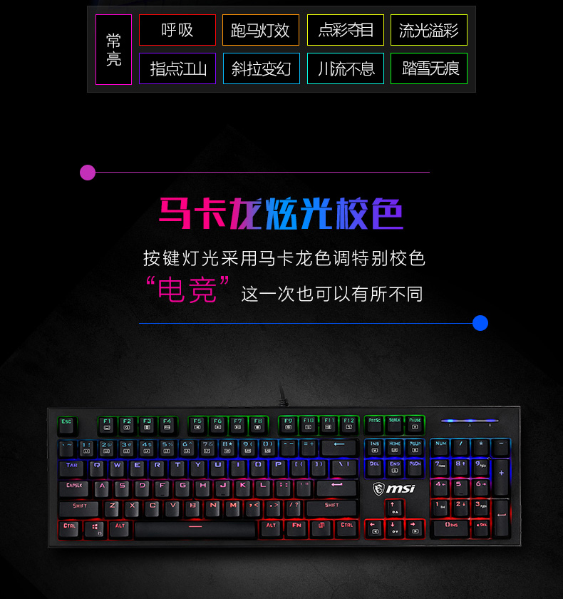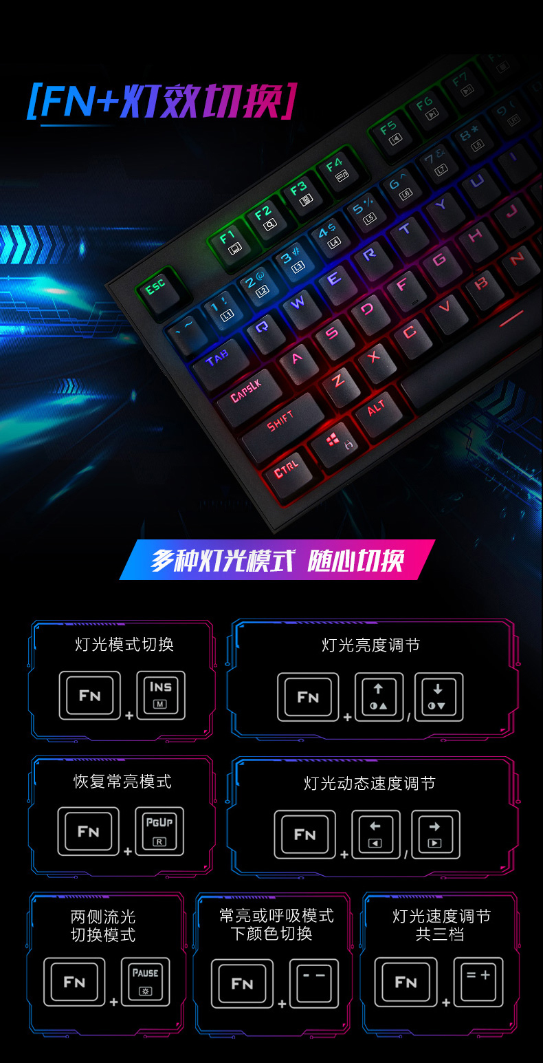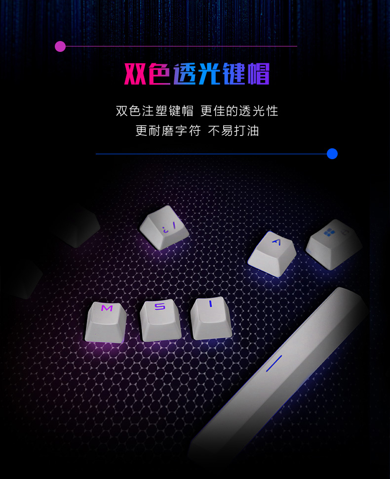 键盘采用标准按键设计,全键无冲,支持多种背光模式。面板采用铝合金一体成型,提升品质耐用度,键盘底部有排水孔放溅水设计。键帽采用双色注塑工艺,长时间使用不掉色,不沾指纹。
