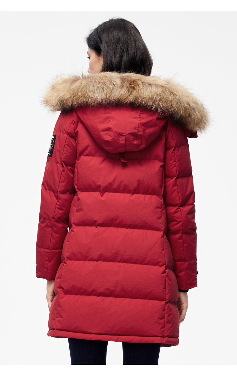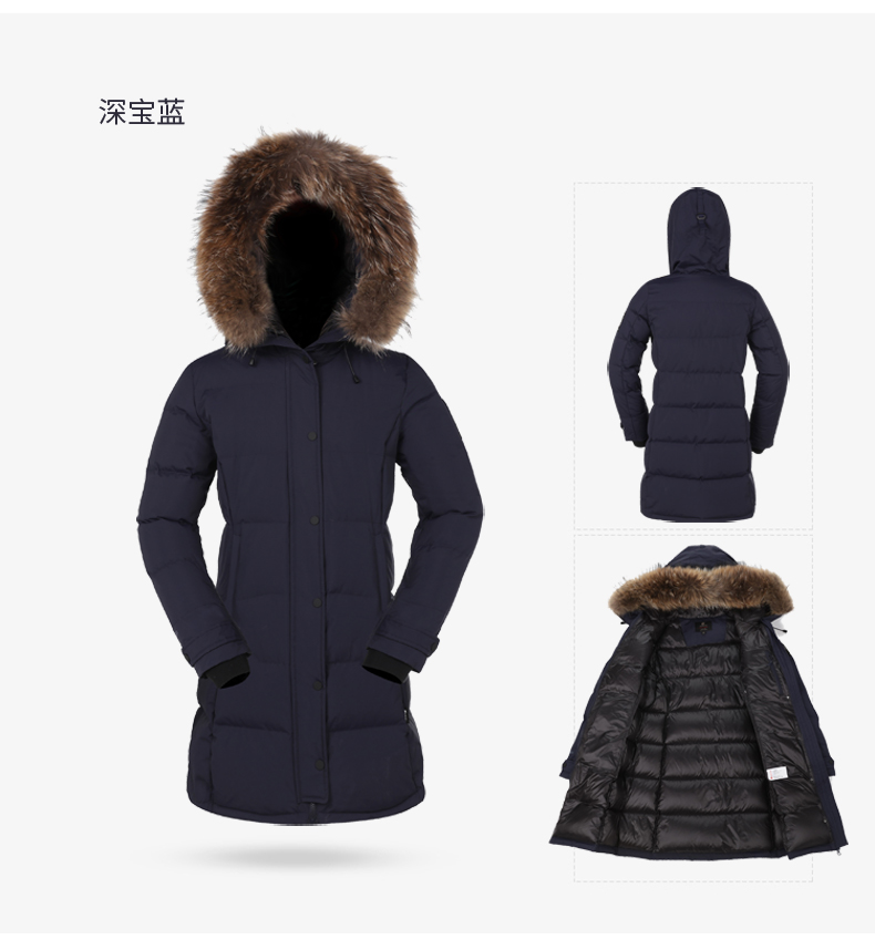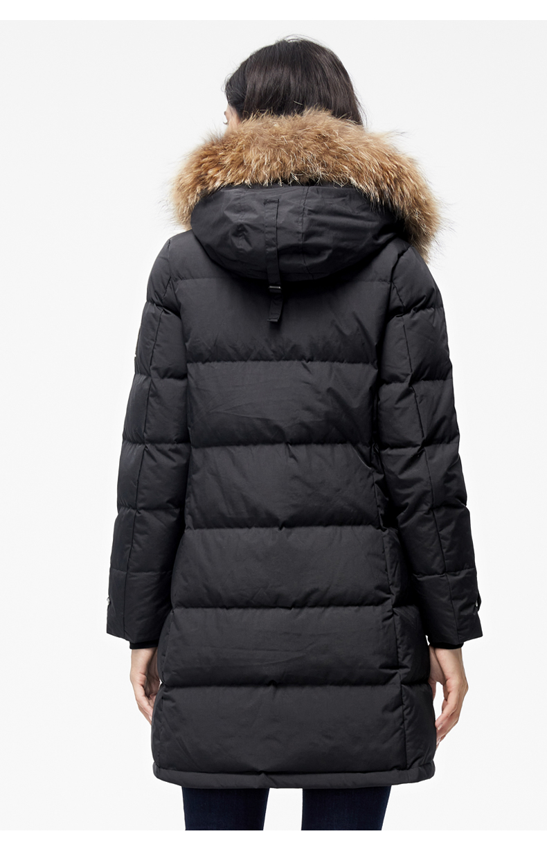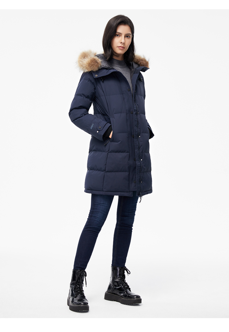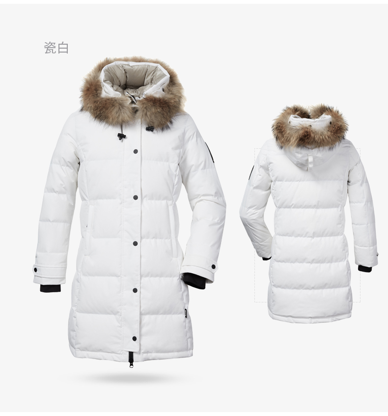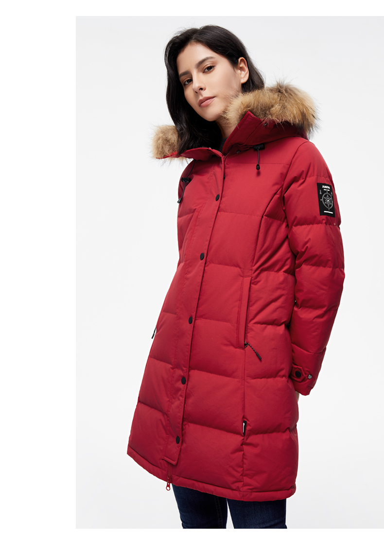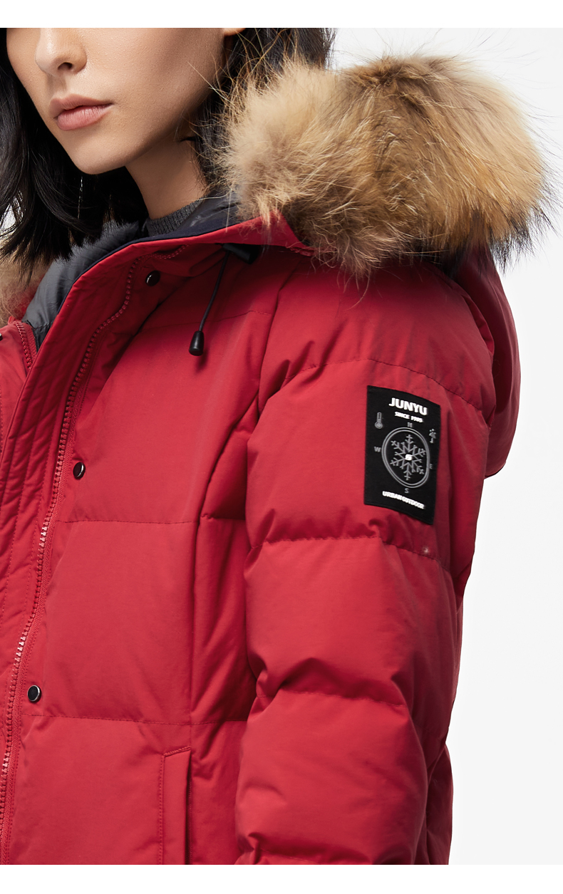 这款君羽雪岩女中长款羽绒服,属于严寒系列,可抗0℃~-15℃,是2018年的冬季款,内里填充了800蓬90%鹅绒,M码充绒177克,属于中厚款羽绒服,外层是高密度耐磨锦纶布,伴有压胶加持,可防风防雨雪。直筒微收腰版型,长度过臀及大腿。