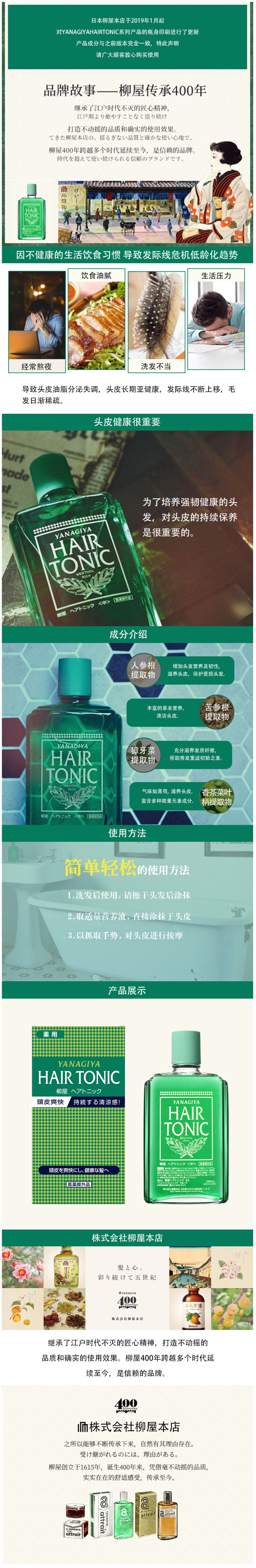 这款柳屋 YANAGIYA 头皮发根营养液,日本进口,采用草本精华配方,日本獐牙菜提取物、苦参提取物、香茶菜叶/柄提取物,具有深度滋润头皮、呵护发根、有效防脱育发、改善常见脱发的功效。配方中不添加香料,无额外的味道,使用时会有沁人心脾的清凉感,规格是240ml。