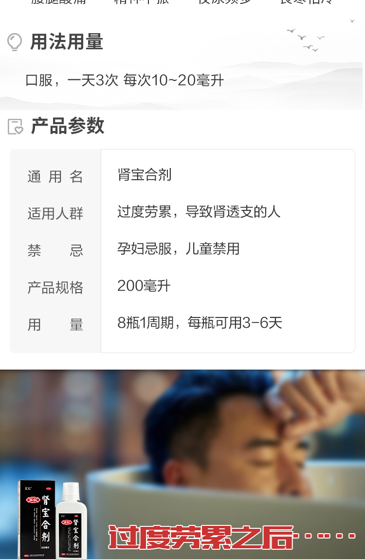 [功能主治]:调和阴阳,温阳补肾,扶正固本。用于腰腿酸痛,精神不振,夜尿频多,畏寒怕冷;妇女月经过多,白带清稀。
