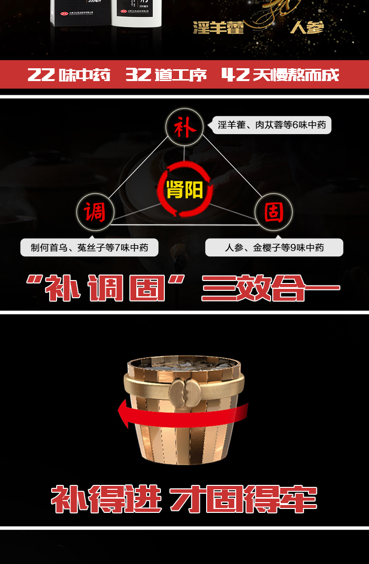 [成份]:蛇床子、川芎、菟丝子、补骨脂、茯苓、红参、小茴香、五味子、金樱子、白术、当归、覆盆子、制何首乌、车前子、熟地黄、枸杞子、山药、淫羊藿、胡芦巴、黄芪、肉苁蓉、炙甘草。辅料为蔗糖、纯化水、苯甲酸钠、羟苯乙酯。