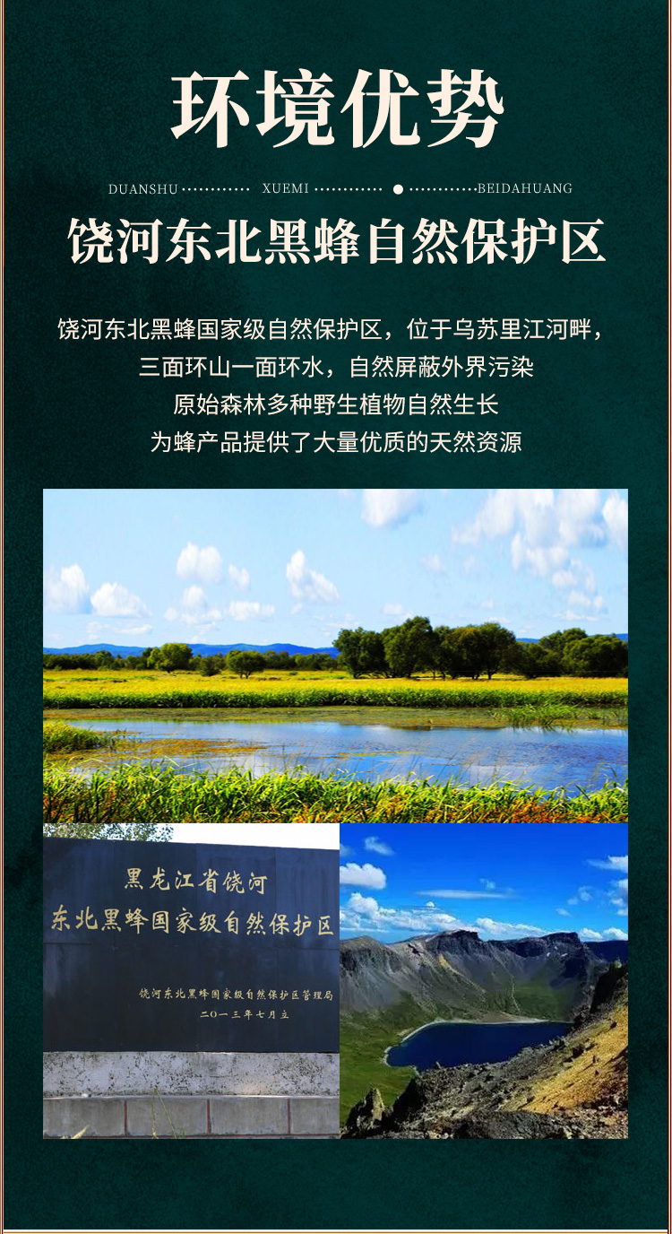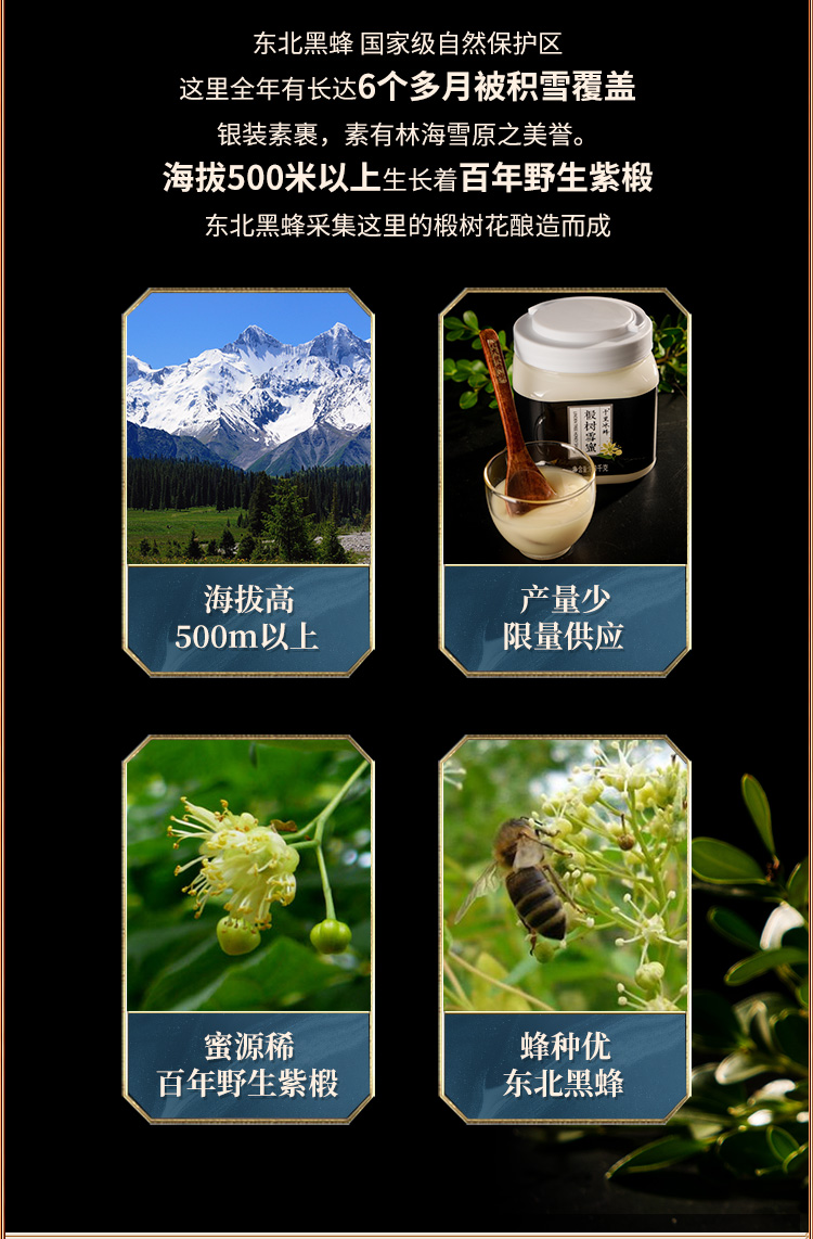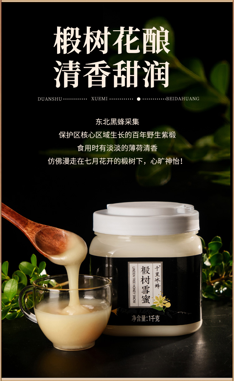 椴树广泛分布于长白山山脉,是长白山最重要的、最优质的野生蜜源植物。椴树蜜呈浅琥珀色或乳白色粘稠液体,低温条件下呈乳白色凝脂状或白色结晶,有油脂样光泽,具有浓郁的椴树蜜特有香味,味道甜润适口,营养价值高,易被肠胃吸收。深受欧洲人喜爱,是难得的森林蜜种。