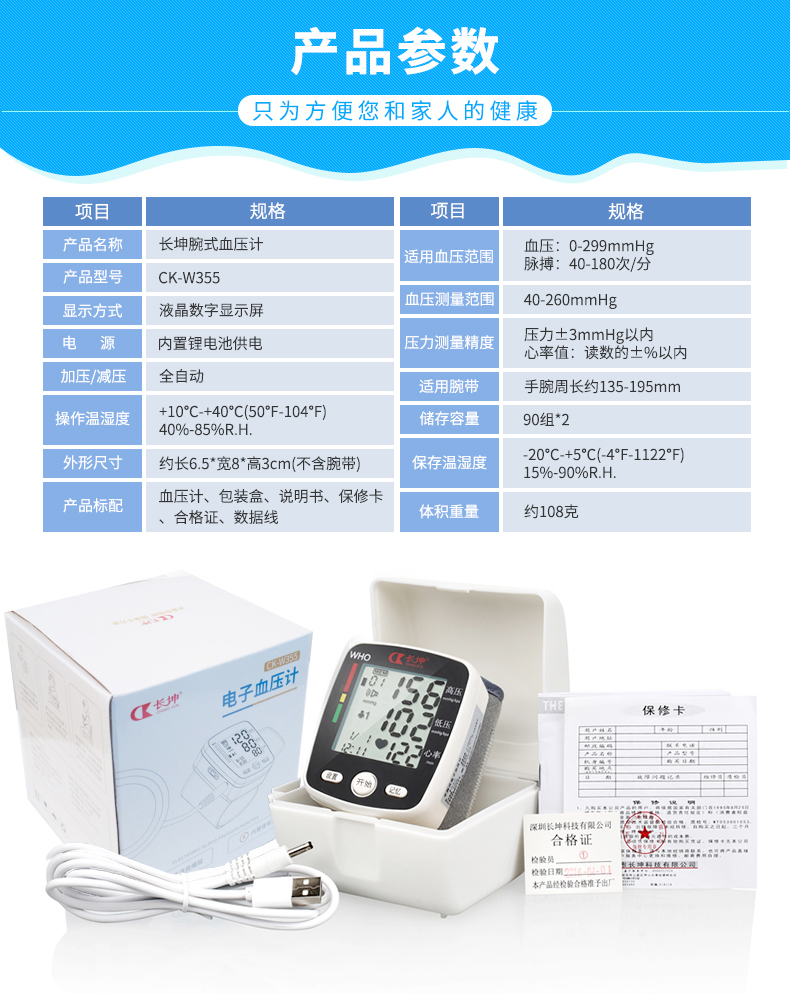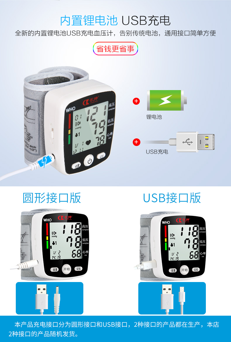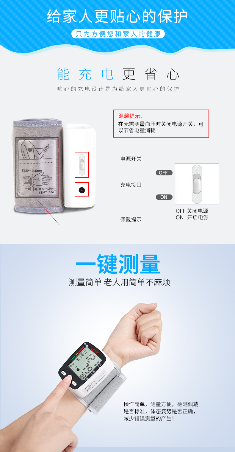 内置锂电池,USB充电,不用频繁充电更省事。测试范围:血压40-260mmHg,心率40-180/次/min。尺寸是6.5*8*3cm,体积小巧,方便携带。